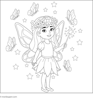 Monkey Pen’s Fairy coloring pages are a window to inspire little ones into the land of fantasy and delight. Parents and teachers can print these sheets for children for a creative playtime and use them for themed birthday parties, simple wall art, school art exhibitions, drawing classes and more.