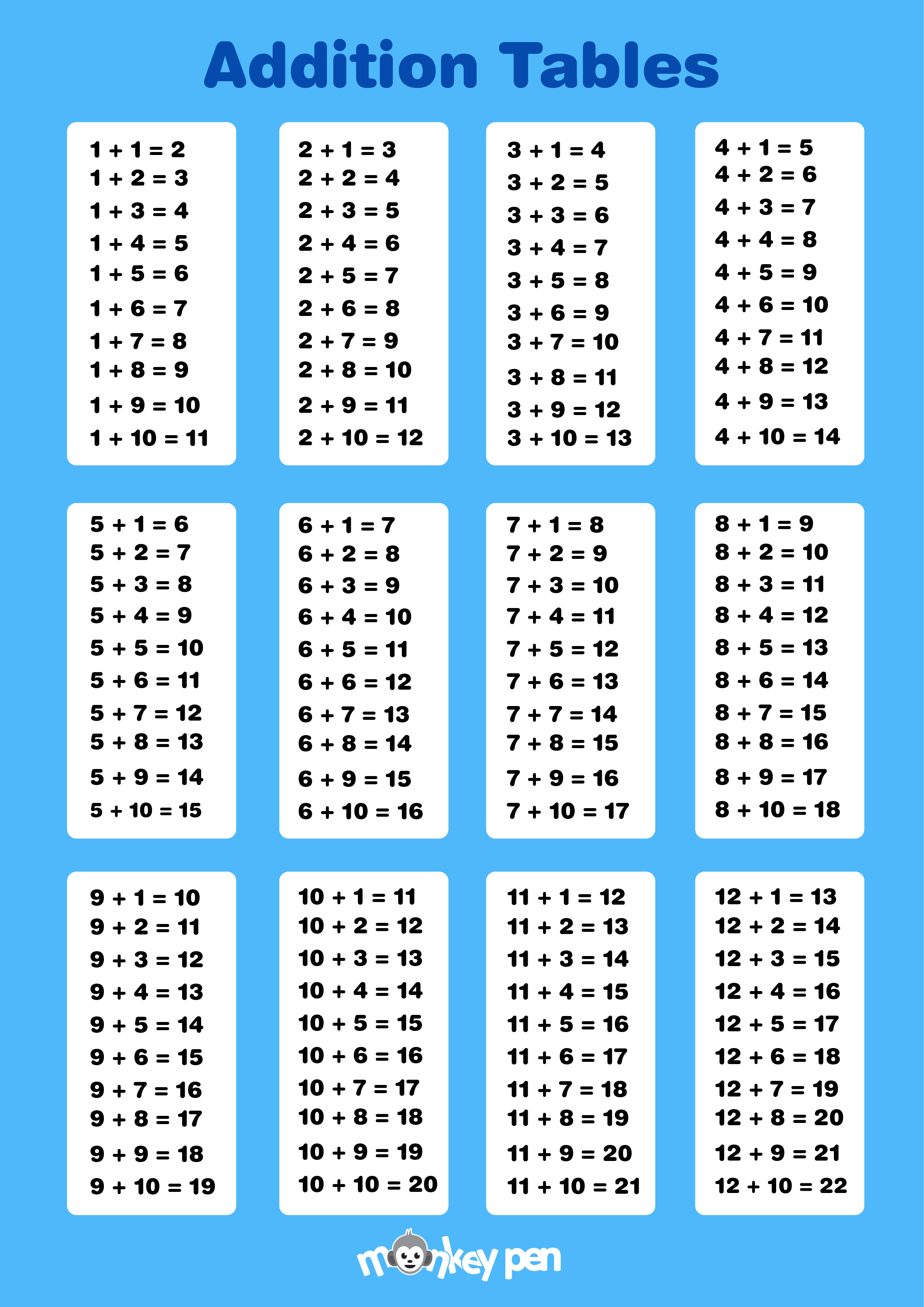 Many children have difficulty with basic arithmetic if they do not have a clear way to practice. This addition chart for children provides a complete visual guide to help young learners understand how numbers work together. It shows sums from 1 + 1 to 12 + 12 in a simple, easy to understand grid format.