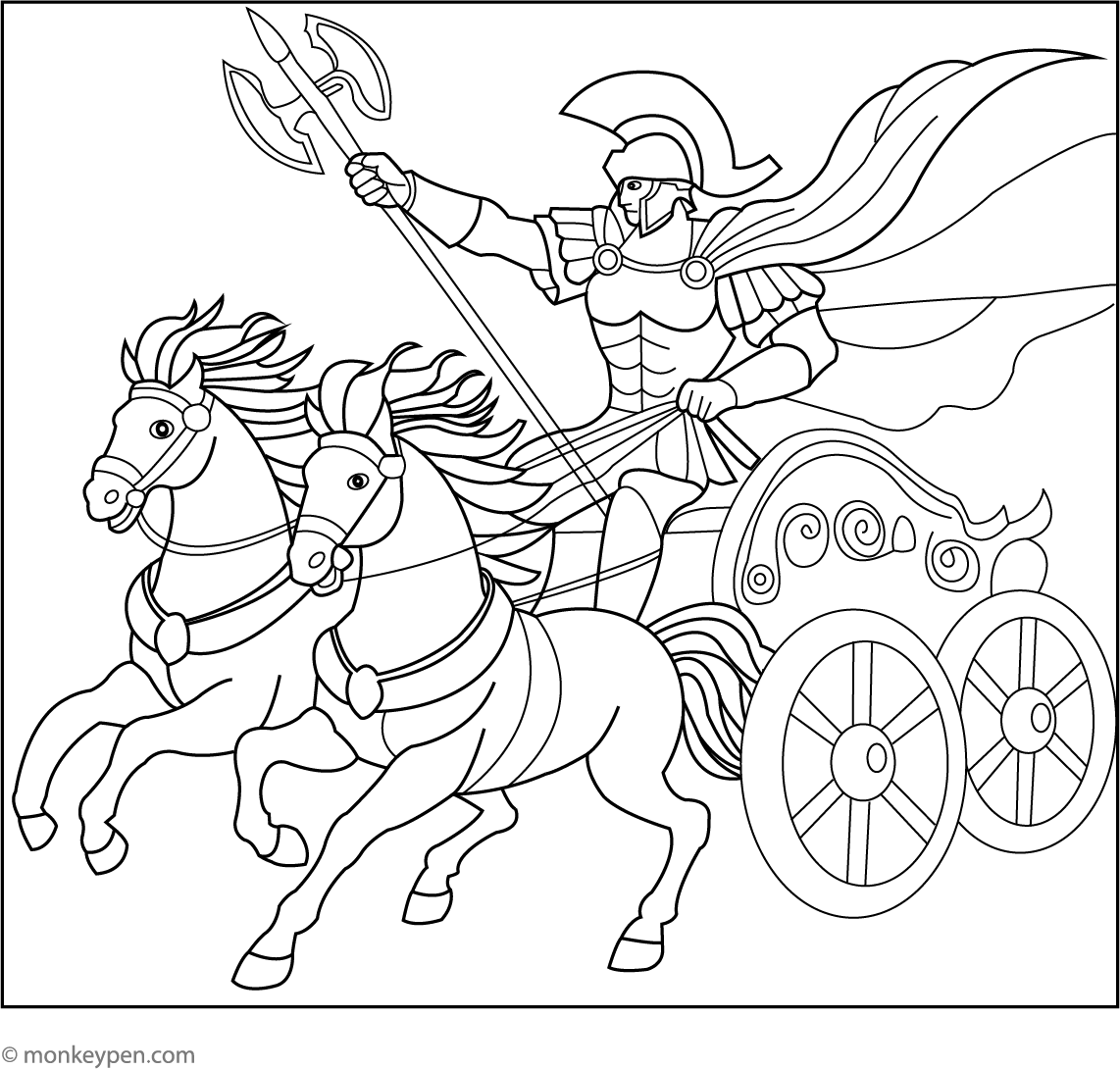 This coloring sheet depicts Ares, the god of war, in full armor, holding a spear and shield, set against a battlefield scene. The illustration includes atmospheric clouds and distant soldiers, creating a dynamic composition. Children can utilize bold colors such as red, gold, and black to convey Ares’s powerful presence.