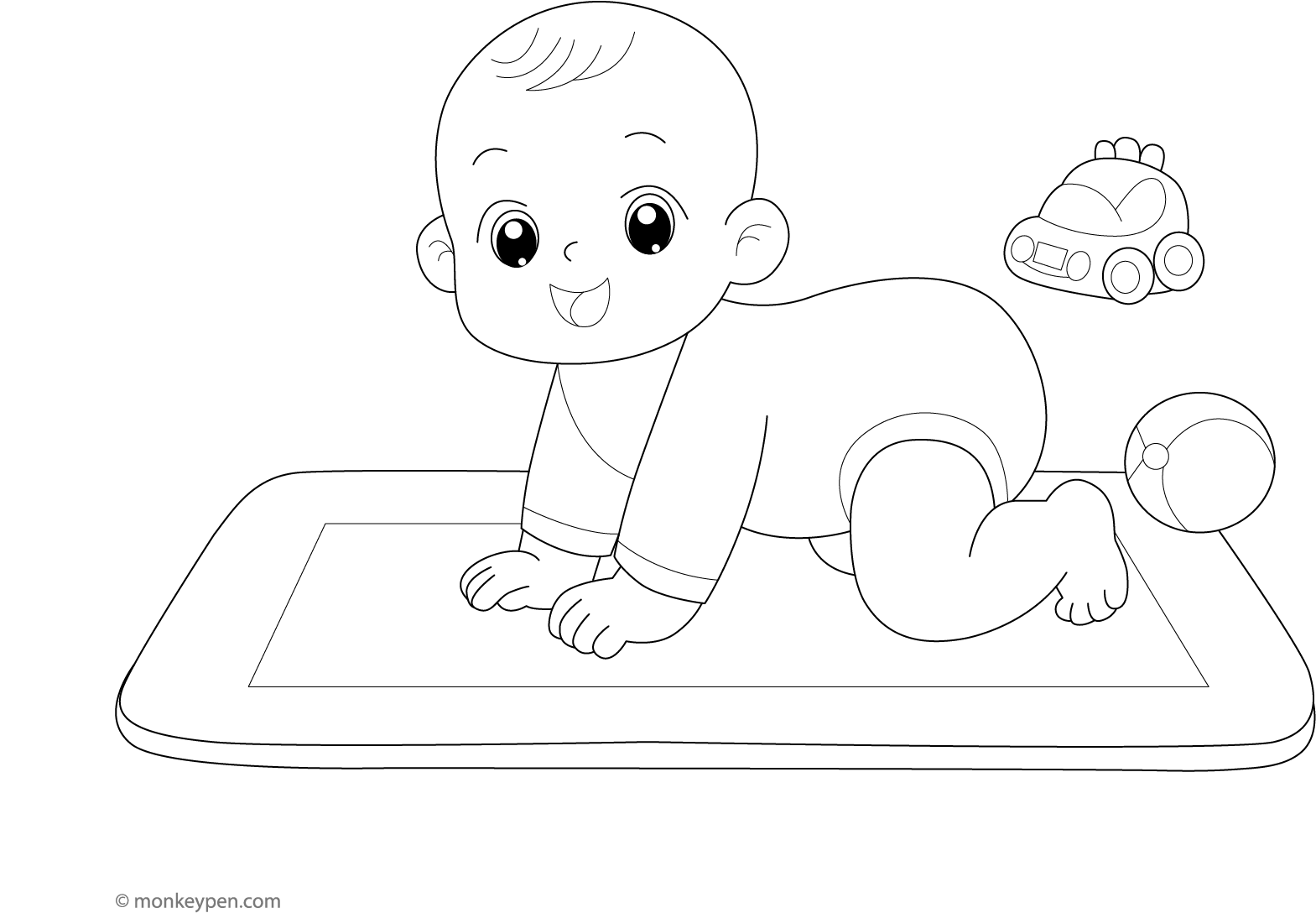 This adorable illustration shows a baby crawling on a colorful playmat, reaching for nearby toys. The playmat features fun shapes, numbers, and letters, creating an engaging environment. The baby appears curious and happy, with toys scattered around. Children can color the baby, playmat, and toys to bring this developmental moment to life.