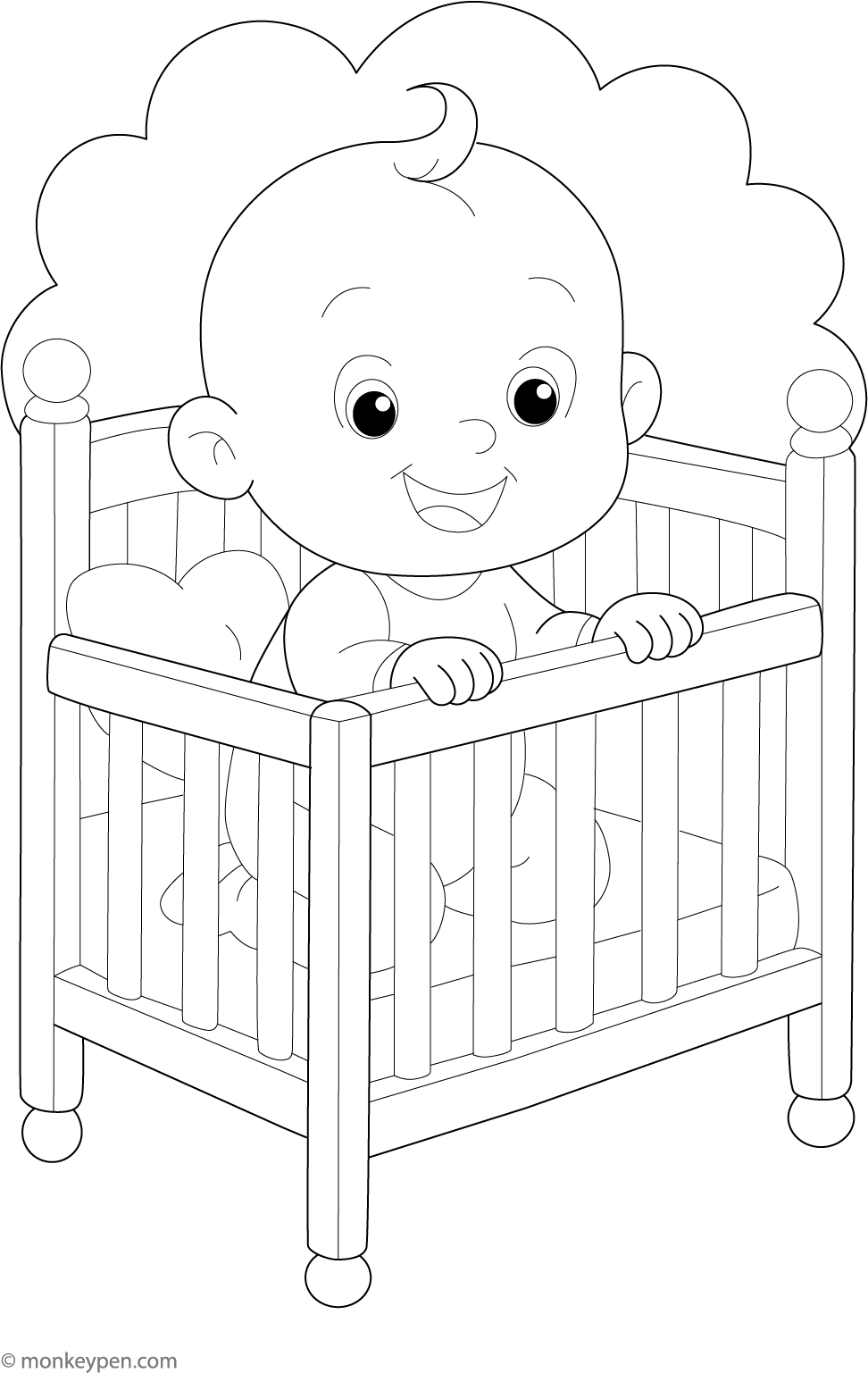 This tranquil scene depicts a baby peacefully sleeping in a crib, surrounded by soft blankets and a gentle mobile overhead. The crib features adorable bedding, possibly with animal or star motifs. A nightlight may cast a soft glow nearby, adding to the calming atmosphere. Children can colour the sleeping baby, the crib, and the nursery details, capturing a serene bedtime moment.