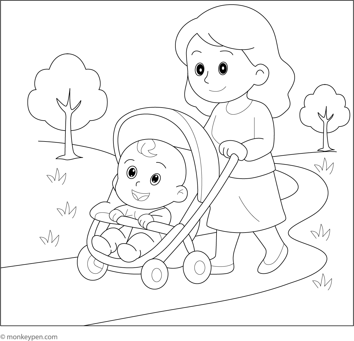 This gentle scene depicts a baby resting peacefully in a stroller, wrapped in a soft blanket. The background might show nature with trees and flowers, or a park scene with sunlight. Children can color the baby, stroller, blanket, and scenic environment, creating a warm and tranquil moment.