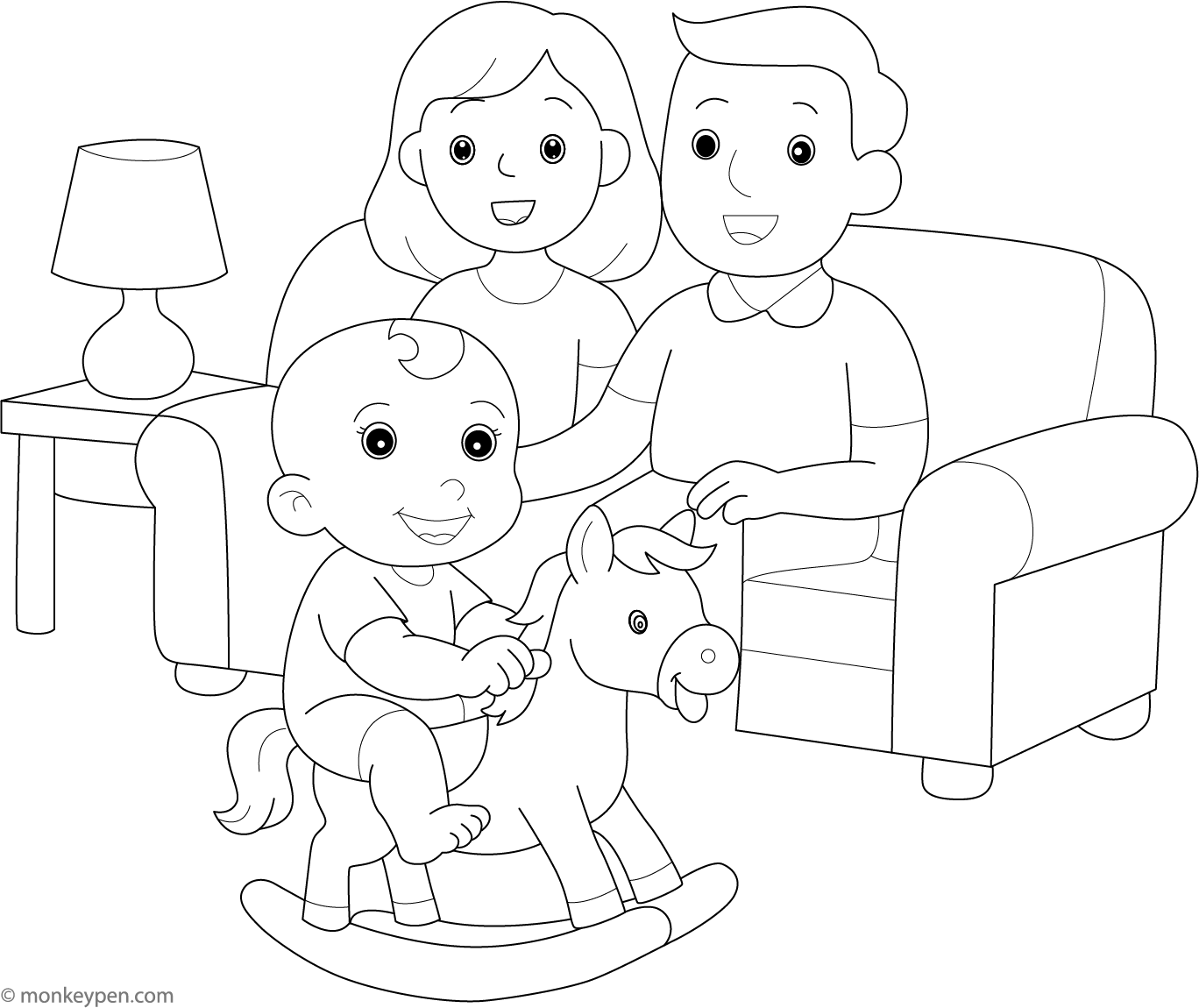 This charming illustration depicts a baby happily riding a rocking horse, gently swaying back and forth. The baby is smiling and holding the reins with small hands, enjoying the playful movement. The rocking horse is detailed with a soft mane, and the background can feature a nursery setting. Children can personalize the scene by coloring the baby, the rocking horse, and the surrounding environment, encouraging creativity and engagement.