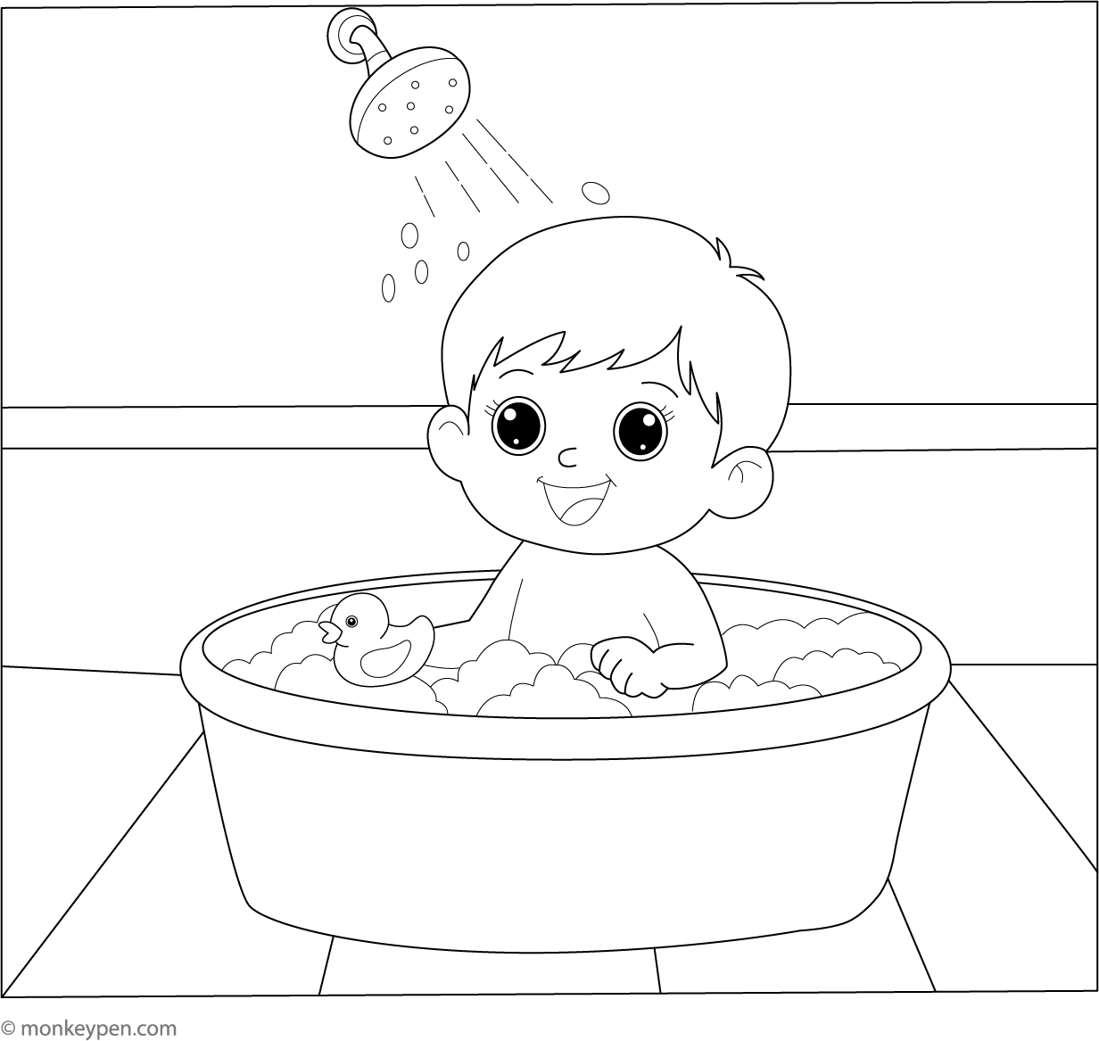 This lively scene illustrates a baby happily splashing in a bubble bath, surrounded by fluffy bubbles and a rubber duck nearby. The setting might include a towel hanging on a rack and a soap dish. Children can color the baby, bubbles, bath area, and cheerful details, capturing the fun of bath time.