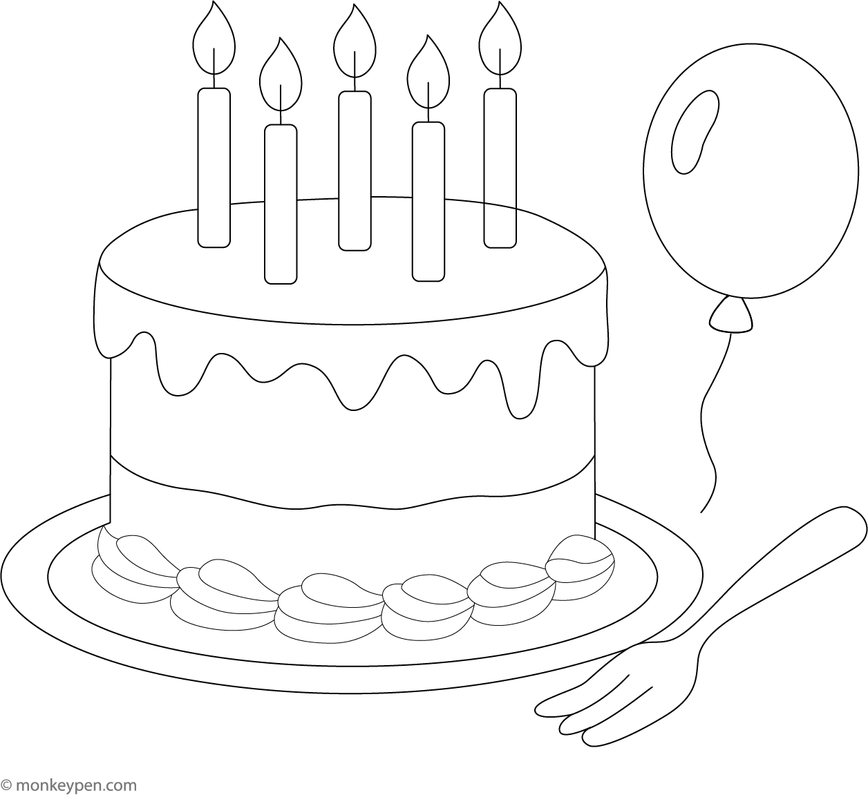 This festive scene shows a classic birthday cake decorated with colourful frosting and topped with candles. Around the cake, balloons float in the air, and colourful streamers drape over the scene, adding a celebratory feel. The birthday cake sits on a table, waiting for the party to begin. Kids can colour the cake, balloons, streamers, and candles in vibrant colours, making this a perfect page for any birthday celebration.