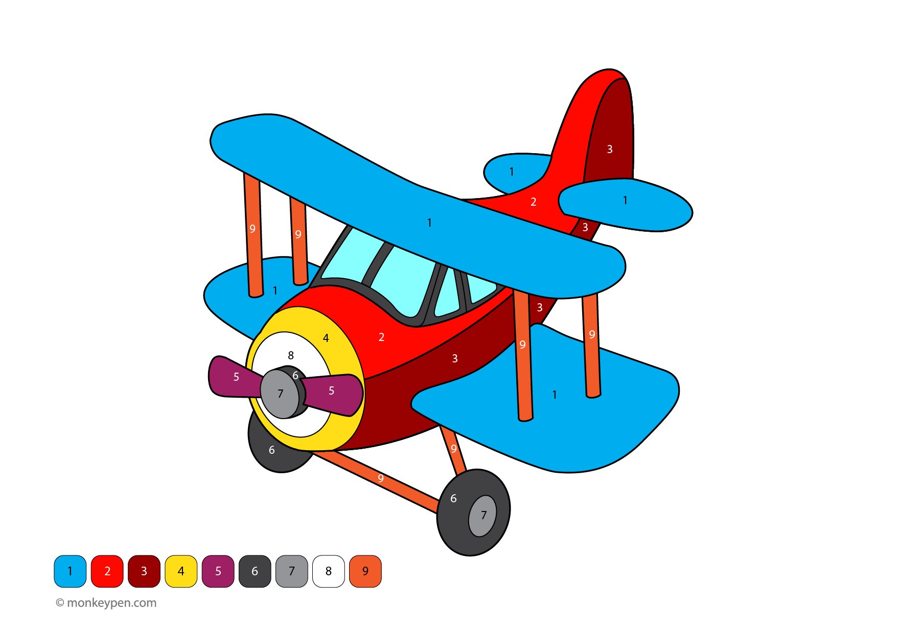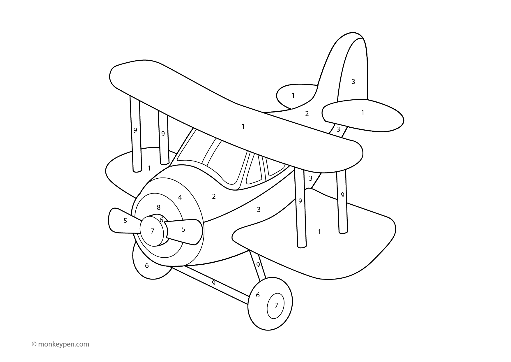 This color-by-number activity features an illustration of an airplane performing a gentle bow in mid-flight, as if greeting passengers below. Children will follow the numbered sections to color the aircraft’s body, wings, and friendly face, along with the blue sky and fluffy clouds. The simple, engaging design transforms the airplane into a welcoming character, promoting number and color recognition while introducing concepts related to air travel.