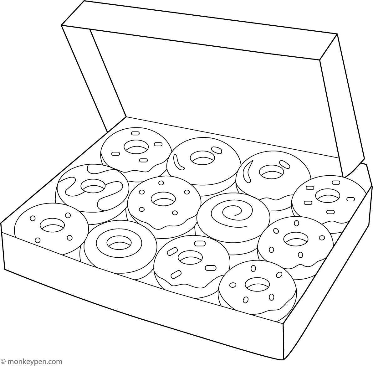 This scene shows an open box filled with freshly made donuts, each decorated with various toppings. Some donuts feature sprinkles, while others are topped with creamy icing or sugar. The open box encourages children to imagine and personalize the donuts by coloring them in their preferred flavors.
