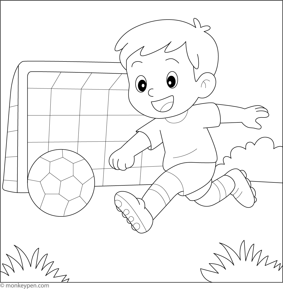 This lively scene depicts a boy actively kicking a football across a grassy field. His focused expression and athletic posture convey the energy of the sport, with the football captured mid-flight toward its target. Children can personalize the scene by coloring the boy’s uniform, the football, and the field, fostering creativity and engagement. This page celebrates the enthusiasm and excitement of playing football.