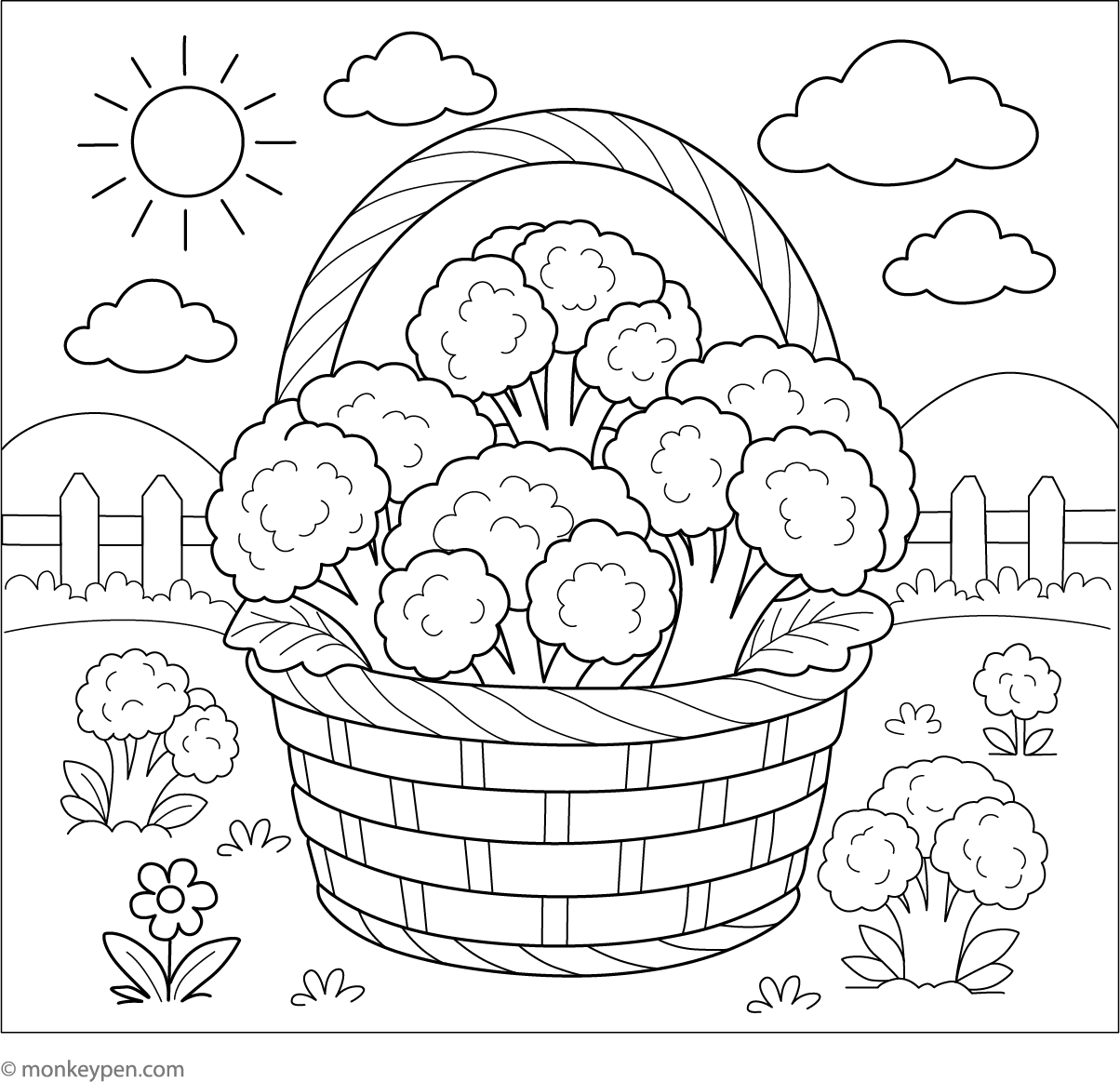 This coloring page portrays a basket filled with fresh broccoli, ready for cooking or market sale. Children can color the leafy tops, the textured florets, and the woven basket pattern. The varied textures offer a mix of simple and detailed areas, supporting careful coloring.