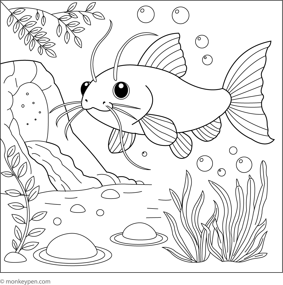 This engaging coloring page presents a brave catfish venturing into a mysterious underwater cave. The scene includes dark rocks, flowing water, and shimmering bubbles that create a captivating environment. Children can use shades of blue, grey, and green to bring the scene to life, while imagining other marine creatures residing within. The simple outlines make it suitable for various age groups, making it an excellent resource for integrating storytelling with artistic expression and fostering interest in marine environments.