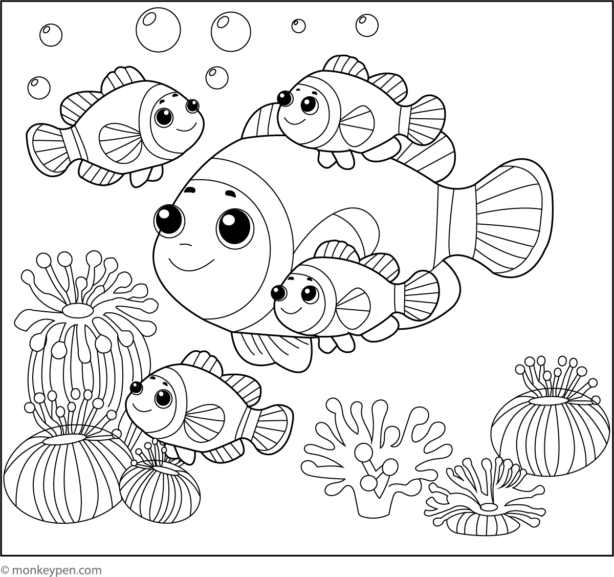 This coloring page portrays a family of clownfish swimming together in their ocean environment. Kids can color the small and larger fish, surrounding sea plants, and the wavy water in the background.