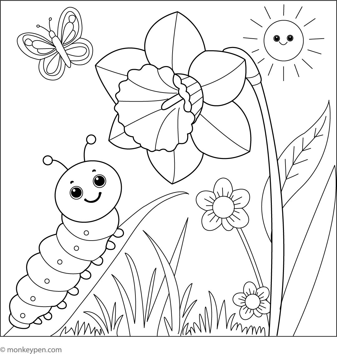 This engaging coloring page features a bright daffodil with a cheerful caterpillar crawling along its leaf or stem. Children can experiment with vibrant colors for the caterpillar segments while applying warm spring shades to the flower. The illustration introduces young artists to garden wildlife and insect life cycles. With friendly outlines and enjoyable details, the page is ideal for developing coloring skills. Children can also add butterflies, grass, or small flowers to create a complete spring garden scene.
