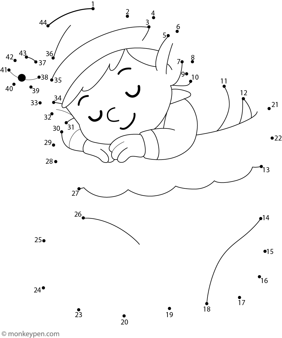 This elf-themed dot-to-dot worksheet offers a cheerful holiday activity for children. As they connect the numbered dots, a friendly elf wearing a festive hat with a big smile sleeping on a flower. Once completed, children are encouraged to color the elf in traditional holiday colors such as green, red, or their preferred festive shades. The activity enhances number recognition, sequencing abilities, and creative expression, making it suitable for seasonal classroom activities, holiday crafts, or quiet at-home entertainment.
