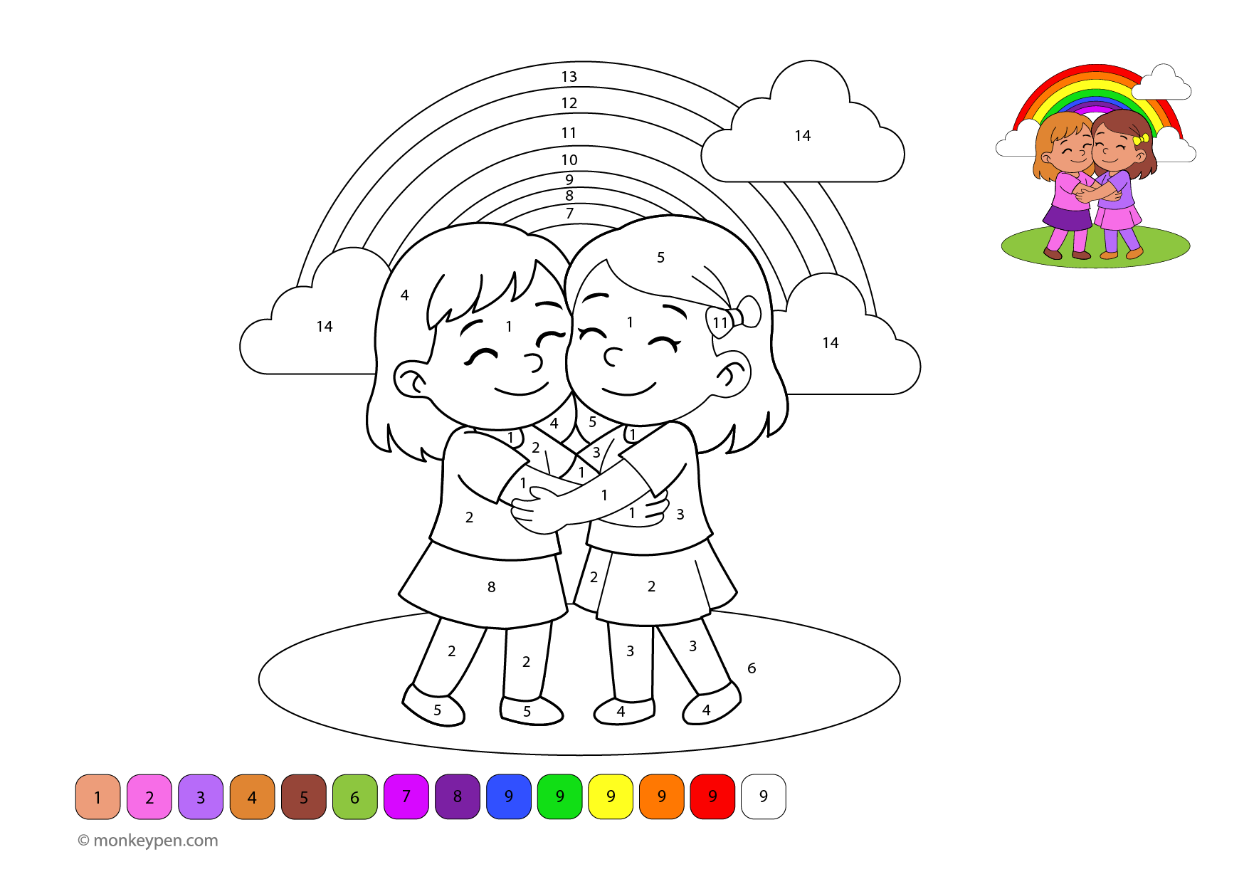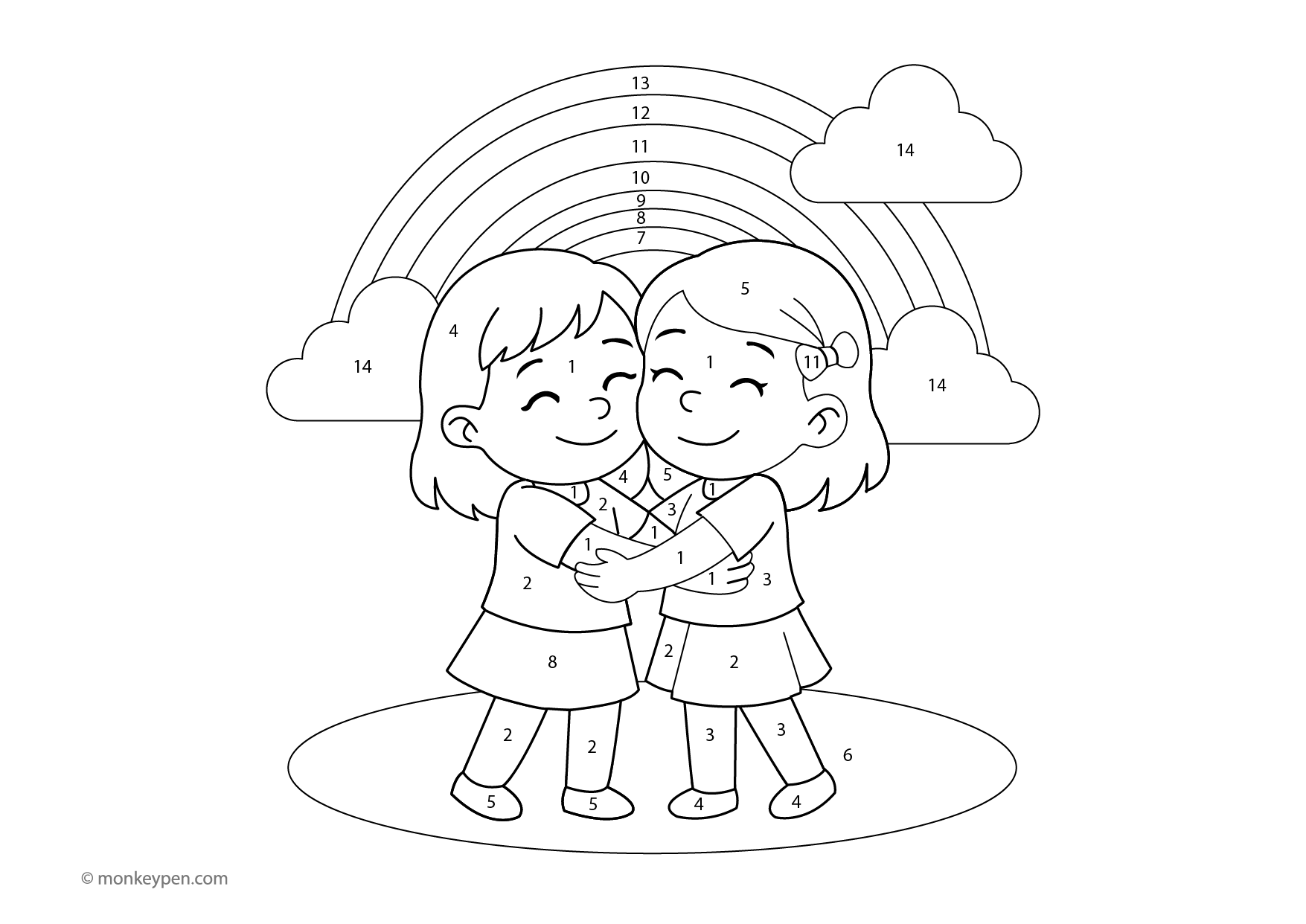 This color-by-number activity illustrates a heartfelt moment between two friends sharing a wide hug. Children can follow the numbered sections to color their clothing, faces, and the vibrant background decorated with hearts and smiling elements. The design emphasizes kindness, empathy, and connection, while supporting number and color recognition skills. It provides a meaningful activity that combines emotional intelligence with creative fun, making it suitable for preschool and early primary-aged children.