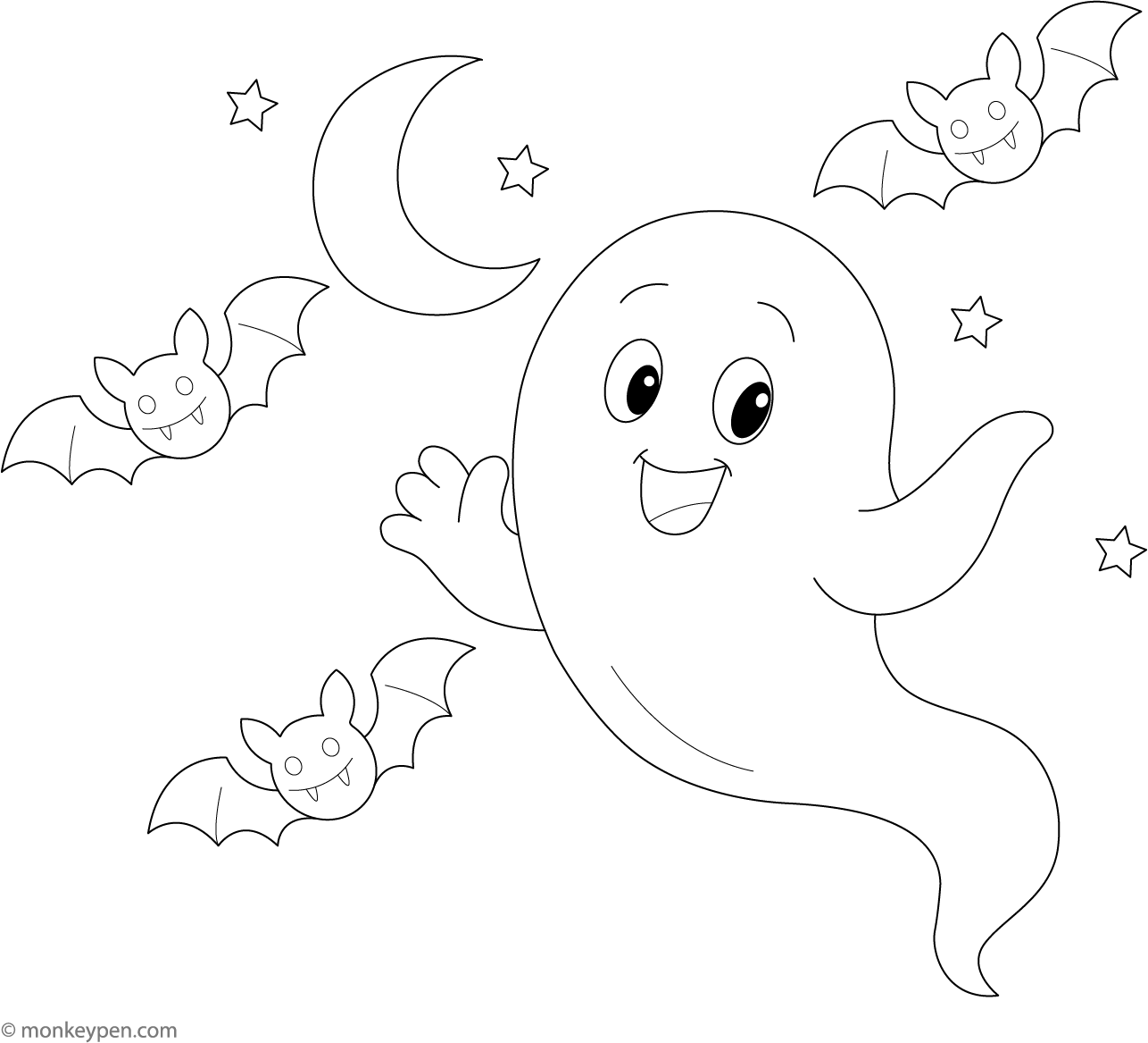 This atmospheric scene features a ghost floating amidst a flurry of bats soaring through the night. The bats swoop and swirl around the ghost, creating a haunting scene that may include a full moon and dark trees in the background. Children can color the ghost, bats, and night sky, adding their own spooky details to this Halloween-inspired illustration.
