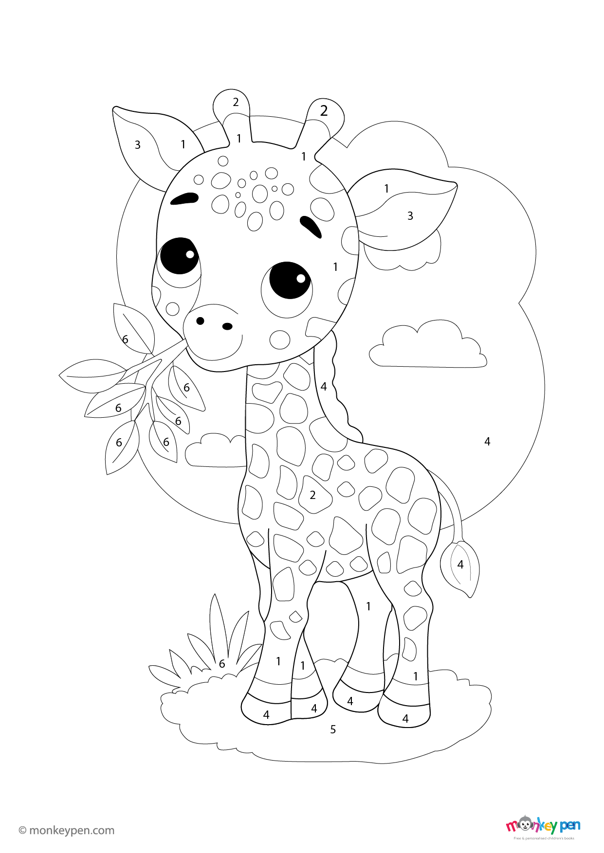 Discover the world of one of the tallest animals with this giraffe color by number page. The illustration features a giraffe with its long neck, ready to be colored by following the numbered guide. Children can practice number recognition, focus, and creativity while enjoying this wildlife-inspired activity.