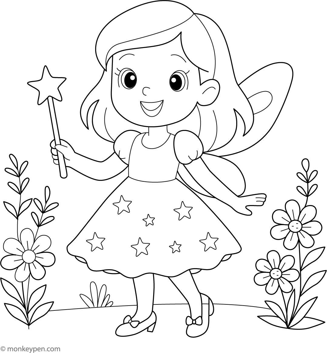 The fairy girl stands cheerfully in a whimsical setting, inspiring creativity and imagination. This page is ideal for children who enjoy fantasy themes, dress-up play, and fairy-tale stories. It combines fashion and imagination in a fun, engaging activity.