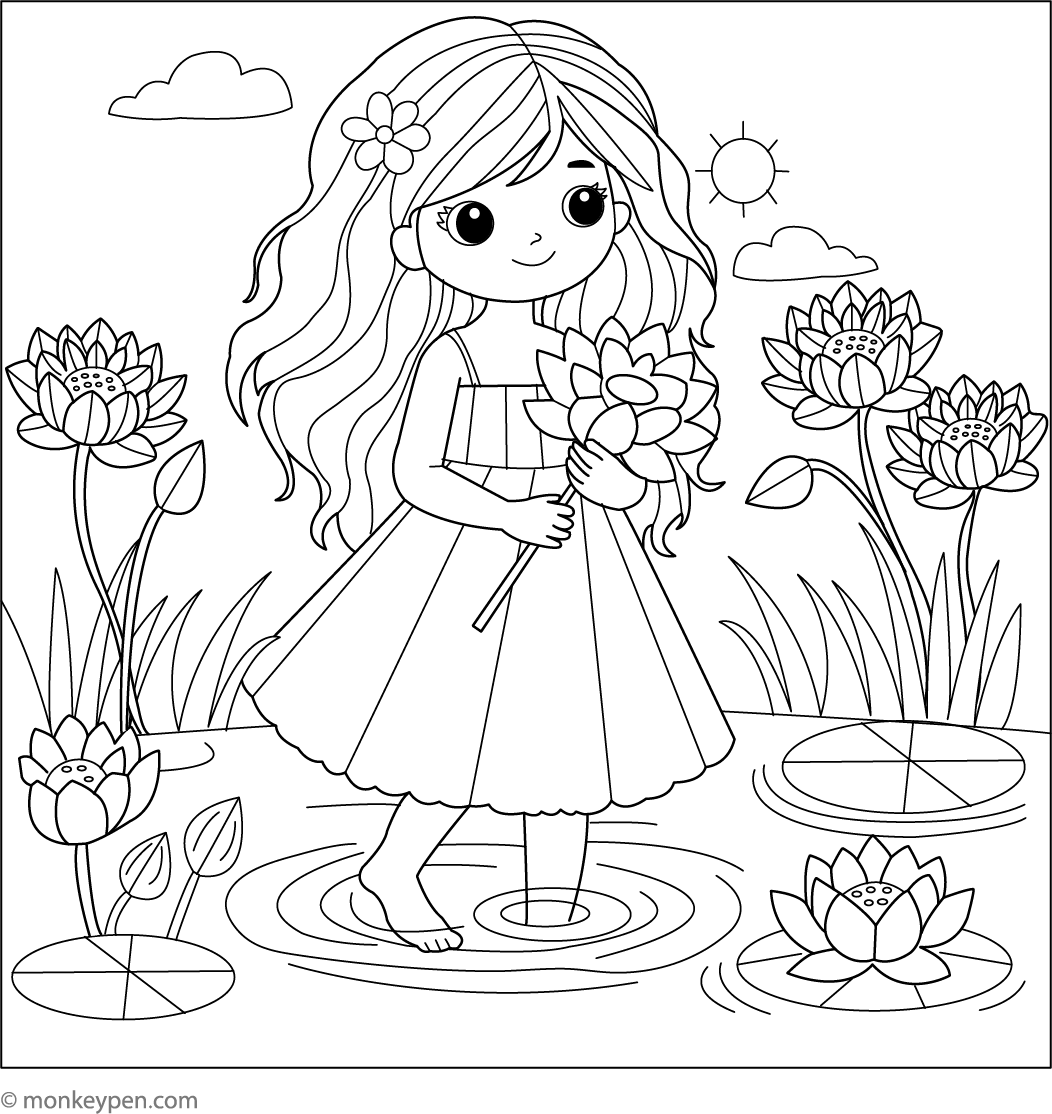 This coloring sheet depicts a cheerful girl holding or appreciating a beautiful lotus flower. Children can choose colors for her clothing, hair, and the lotus petals, encouraging creative expression.