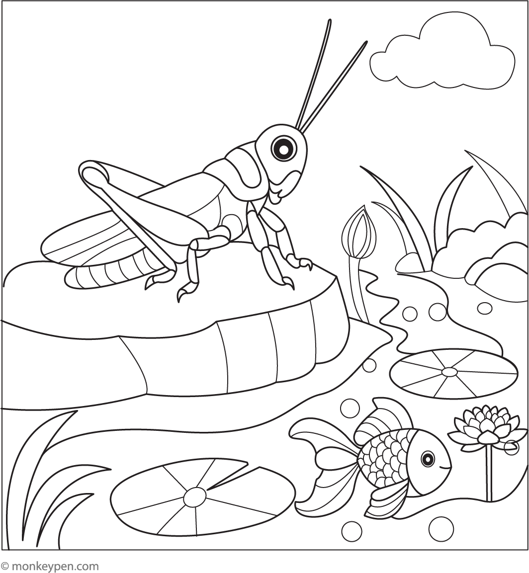 Grasshopper Near the Pond | Free Coloring Pages