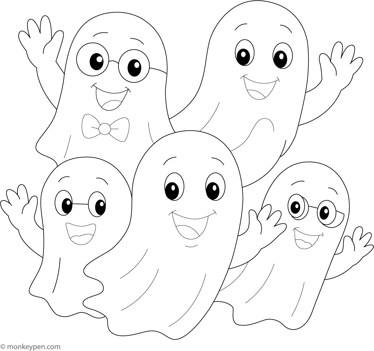 This lively illustration features a group of amiable ghosts greeting with a wave, each displaying unique expressions, from smiling to giggling. The ghosts appear to float happily within a gentle, atmospheric setting that might include stars or a faint moon in the background. Children can enjoy coloring each ghost, experimenting with different expressions and color schemes, bringing this welcoming ghost ensemble to life.