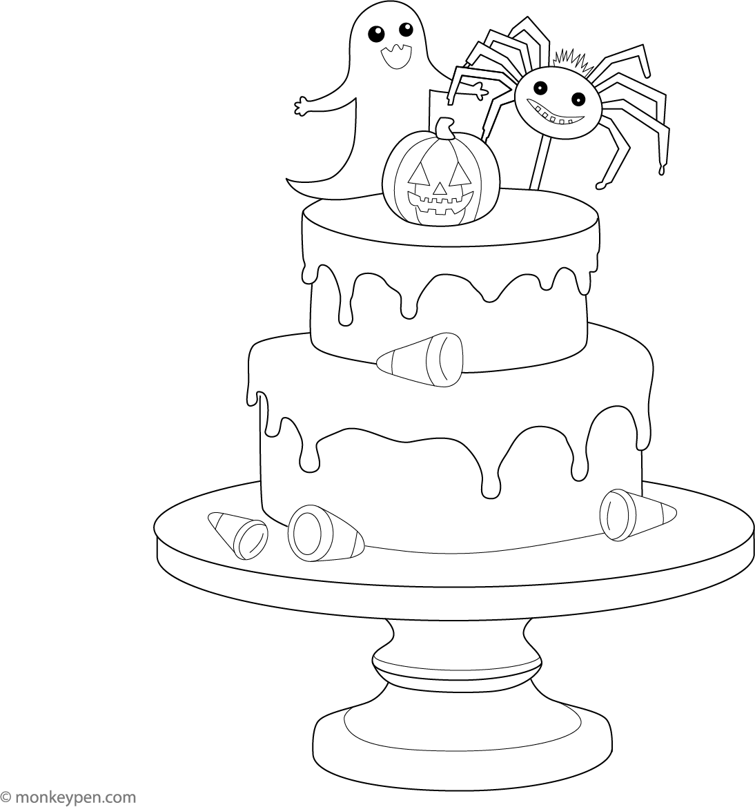This Halloween-themed cake illustration showcases spooky elements such as ghost, pumpkins, spider, and eerie icing designs. The cake features a black and orange color scheme, capturing the essence of the holiday. Children can add their own colors, using dark and bright shades to personalize their creepy masterpiece for Halloween celebrations. Additional decorations like candy or mini skulls can be imagined atop the cake for extra fun.