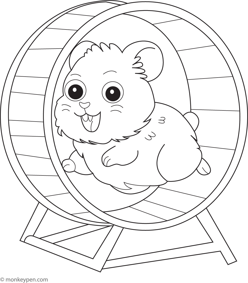 This illustration features a small hamster actively running within a hamster wheel, which is rendered with textures resembling wood or metal to encourage creative colouring. The hamster’s joyful expression promotes imagination of motion and activity. This scene supports developing fine motor skills and fosters an appreciation for observing movement in pets.This free, printable page introduces children to pet care concepts while promoting focus, motor skills, and creativity. colouring this lively scene allows children to imagine the hamster's active and joyful life.