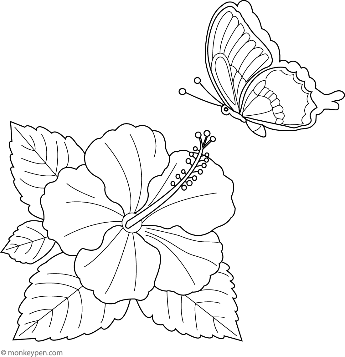 Hibiscus and Fluttering Butterfly | Free Coloring Pages