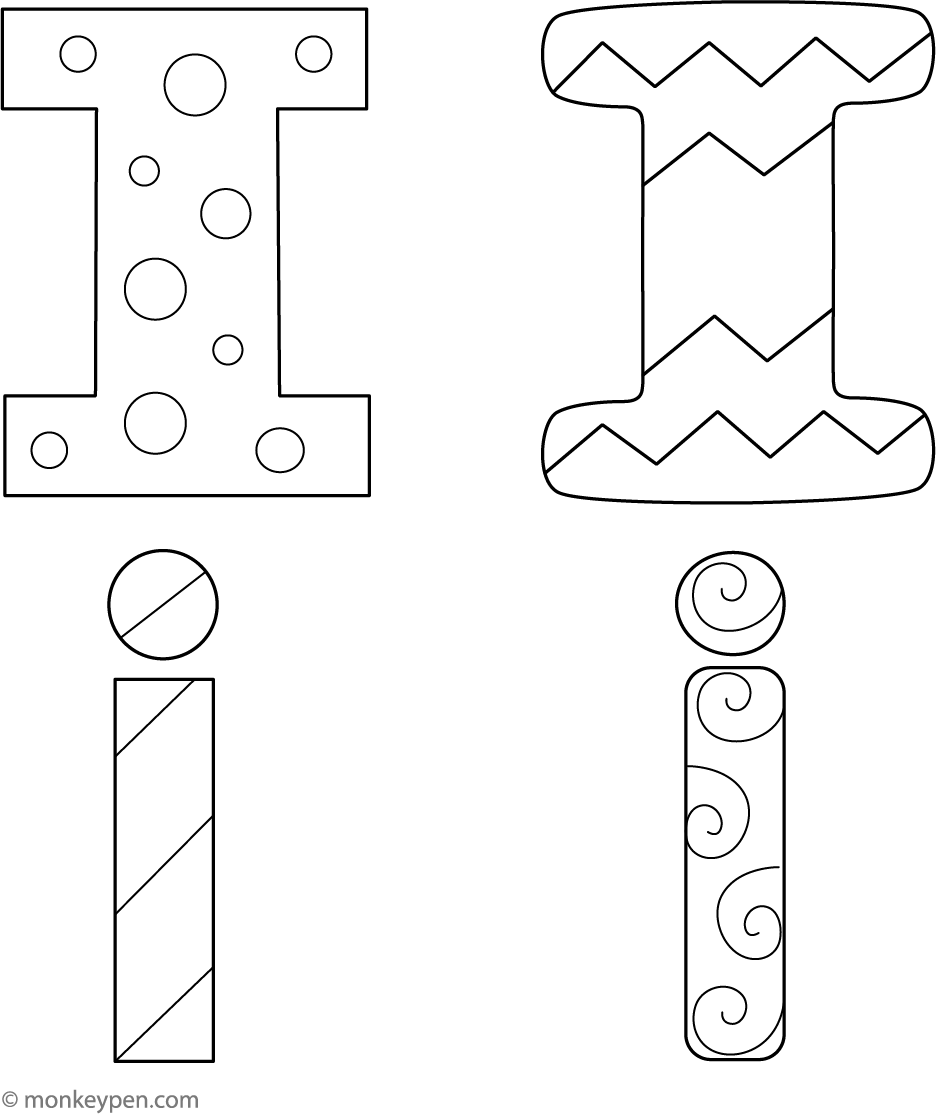 This coloring page presents the letter I in a variety of fonts, ranging from bold and decorative to whimsical and playful. Children can color each version in different colors, gaining exposure to how the same letter can appear in multiple styles.