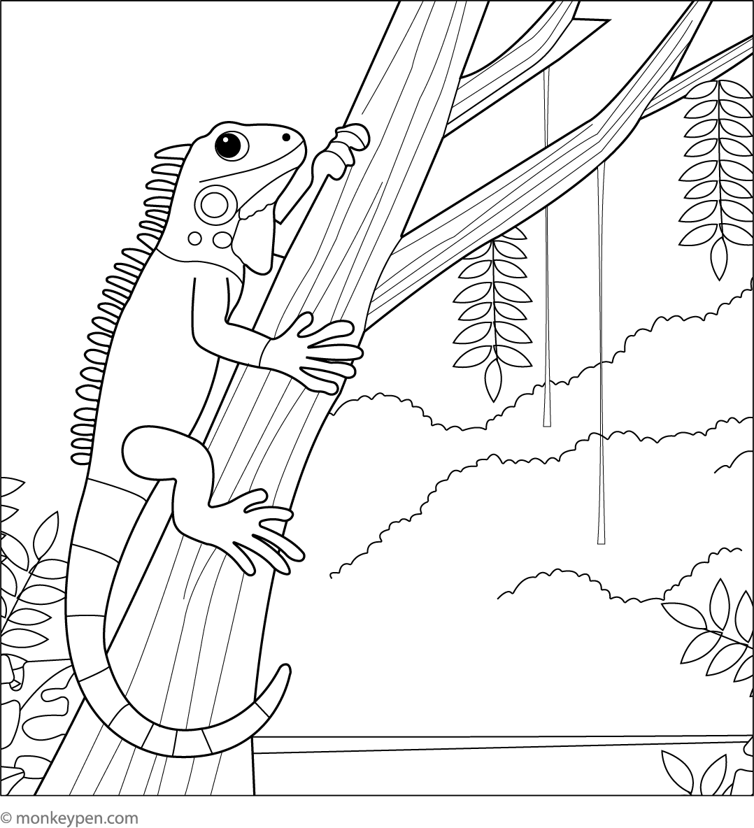 This vivid colouring page features an iguana either climbing or resting within a dense rainforest. The scene includes leafy plants, tall trees, and possibly other rainforest details like birds or insects in the background. Children can use natural greens for the iguana and foliage while incorporating pops of colour for flowers or additional creatures. This free printable page introduces children to rainforest ecosystems while fostering their focus, creativity, and artistic expression.
