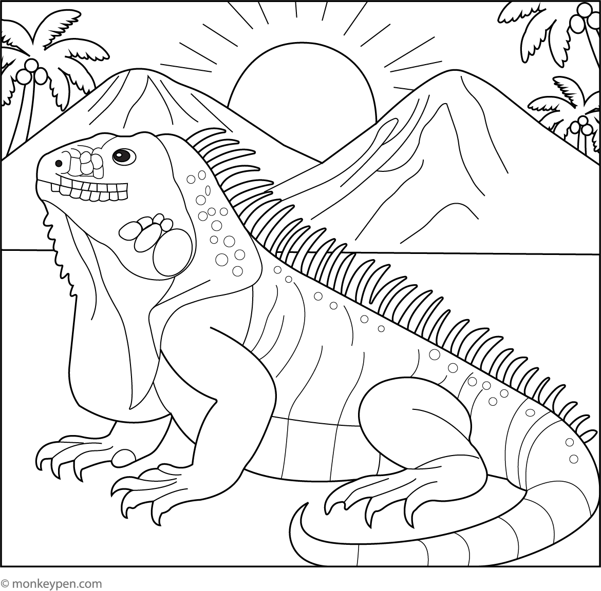 This vibrant colouring page depicts an iguana basking under a radiant sunset. The scene features the silhouette of trees and mountains, with a sky filled with warm gradient hues. Children can colour the iguana in greens or browns and apply oranges, pinks, and yellows for the sunset. This free printable page inspires imagination and teaches children about the beauty of nature while enhancing their focus and fine motor skills.