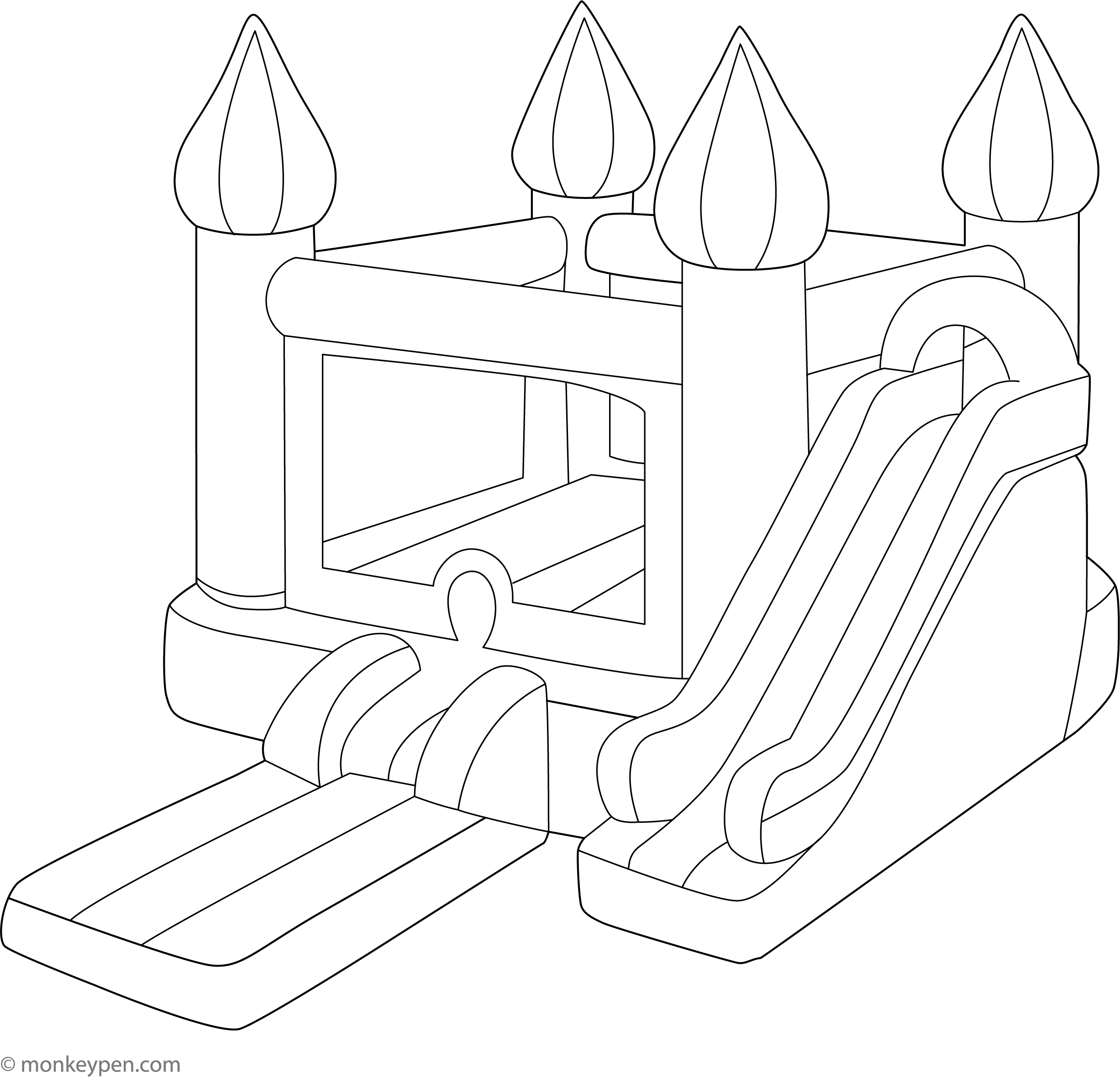 This lively illustration depicts an inflatable bounce castle with features such as turrets, mesh sides, and children bouncing inside. Additional elements like balloons or party banners may be included.Kids can color the structure in bright, bold shades like red, blue, green, and purple, and add background details such as clouds or a sunny sky.The scene promotes energy, happiness, and self-expression, while supporting pattern recognition, motor control, and social interaction. Suitable for party themes or active play discussions.