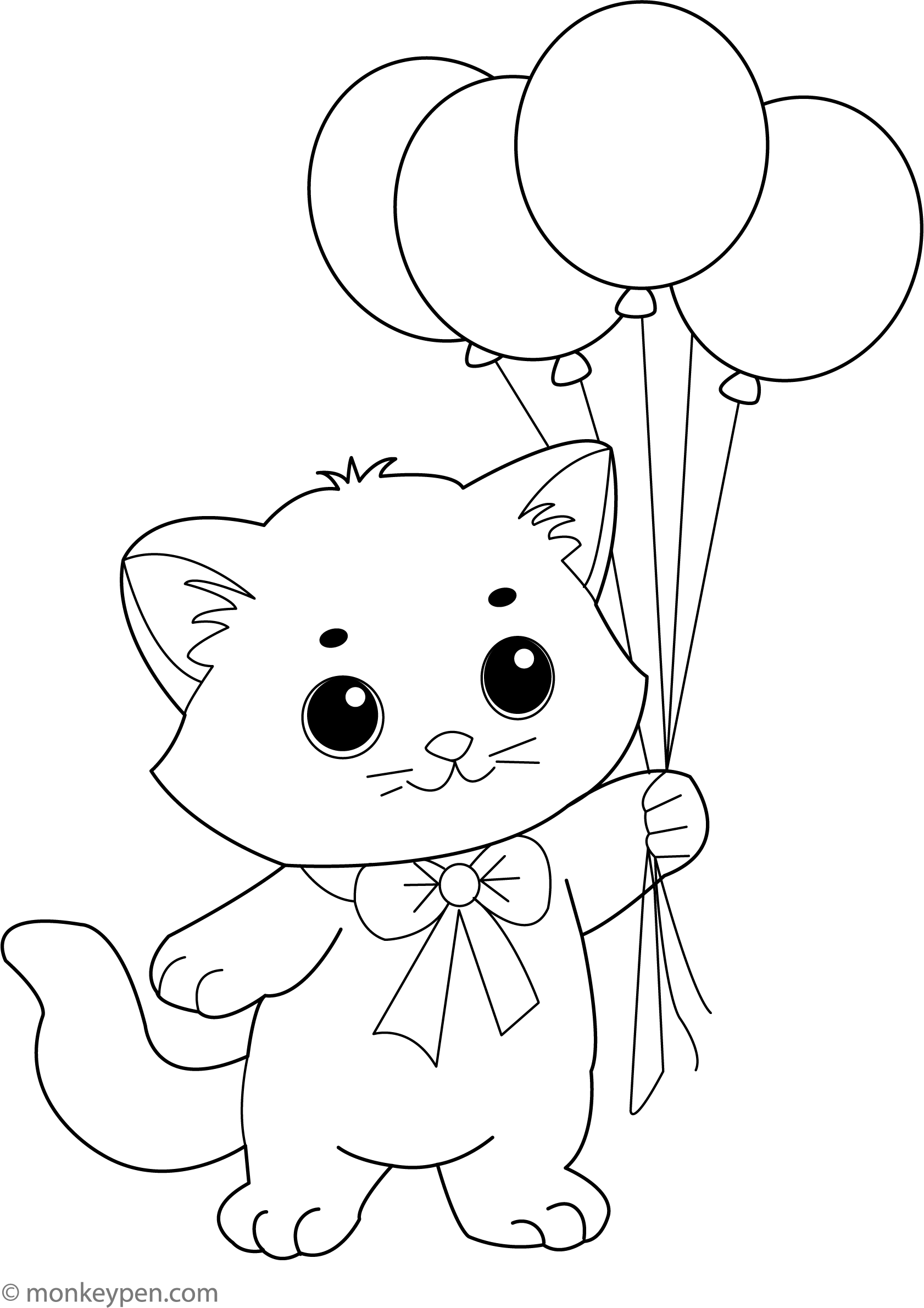 This joyful coloring page captures a lighthearted moment as a cheerful kitten floats along, holding a bunch of colorful balloons. With its wide eyes and lifted paws, the kitten looks ready for adventure—perhaps soaring through the sky or heading to a festive party in a dreamlike world. Children can use soft greys, oranges, or whites for the kitten, and explore an exciting palette of reds, blues, yellows, and purples for the balloons. The scene is open to interpretation, allowing kids to add clouds, stars, or even other animals joining in on the fun.