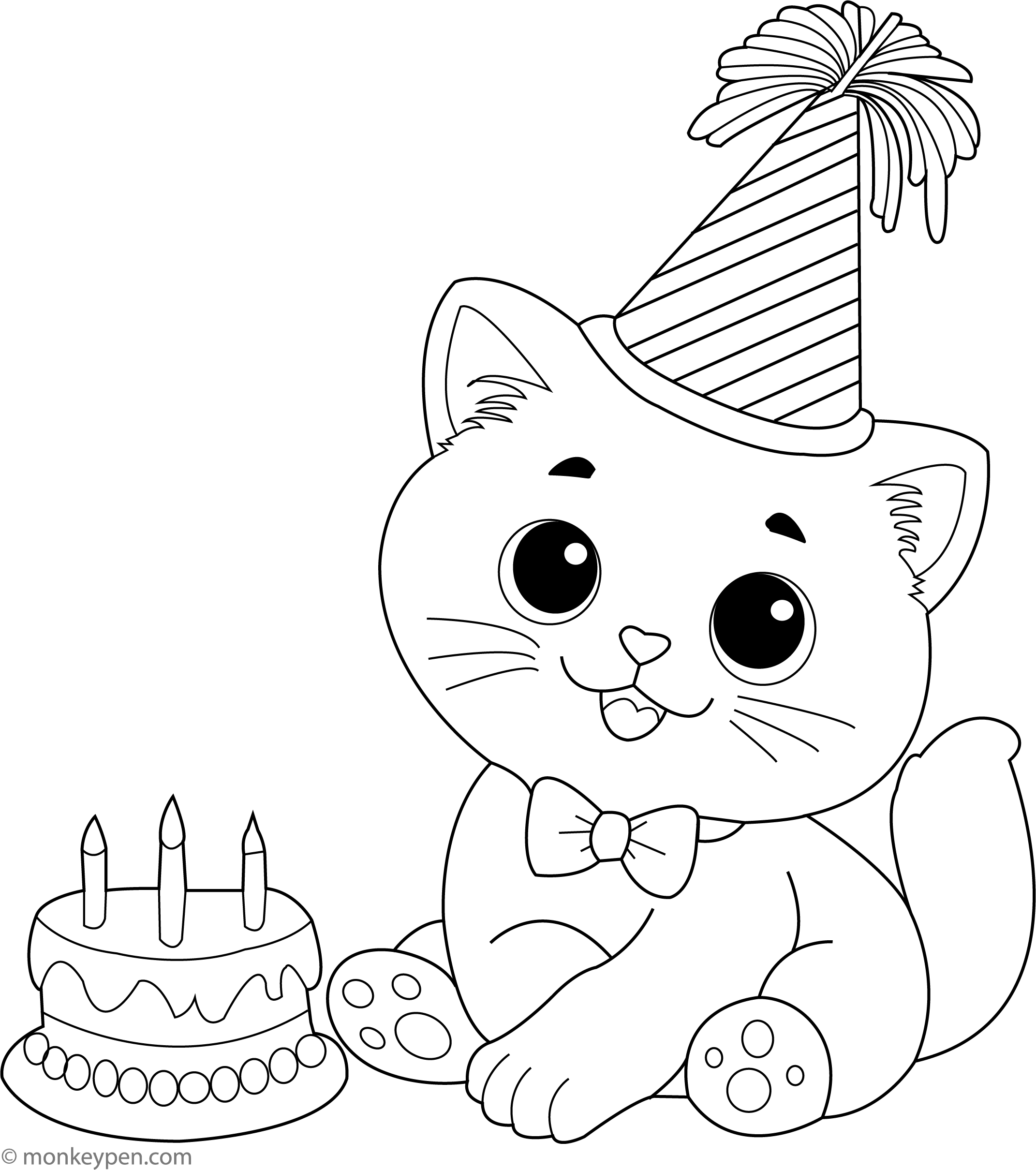 This cheerful coloring page features a playful kitten donning a festive birthday hat, surrounded by balloons, confetti, and a delicious cake waiting to be shared. The kitten’s wide-eyed excitement and joyful pose set the stage for a fun-filled celebration. Children can bring the scene to life with soft greys or oranges for the kitten and lively shades like red, yellow, blue, or purple for the party decorations. From candles to streamers, every detail invites young artists to explore their creativity and express the joy of birthdays.
