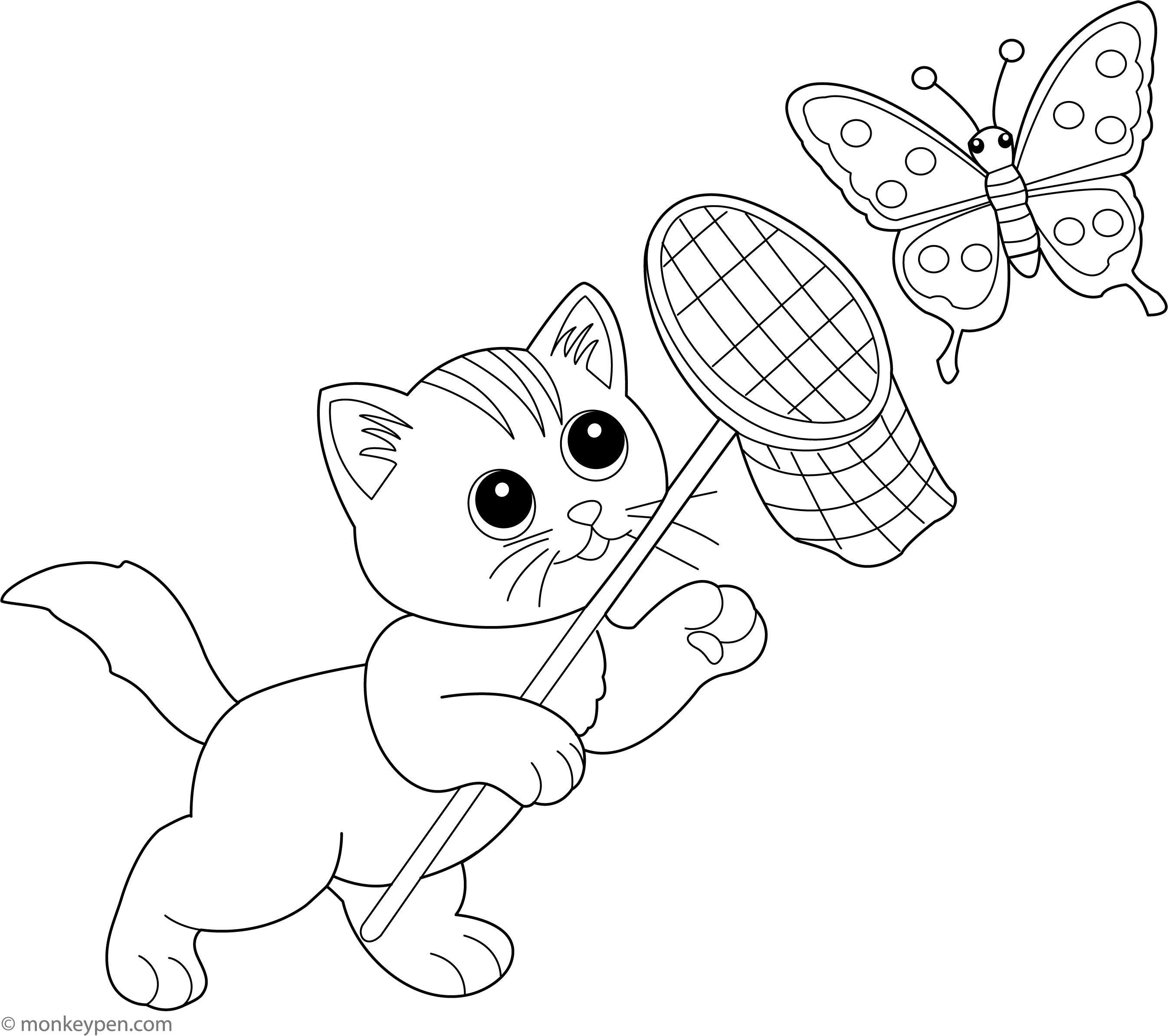 This lively coloring page captures the adventurous spirit of a kitten playfully leaping through a sunny meadow, butterfly net in paw, hoping to catch a fluttering butterfly. Surrounded by tall grass, buzzing insects, and swaying flowers, the scene invites kids to imagine a fun-filled outdoor escapade. Young artists can color the kitten using soft oranges, greys, or whites, and bring the net, butterflies, and meadow to life with vibrant hues like yellow, blue, pink, and green. Each stroke adds personality and excitement to this whimsical chase.