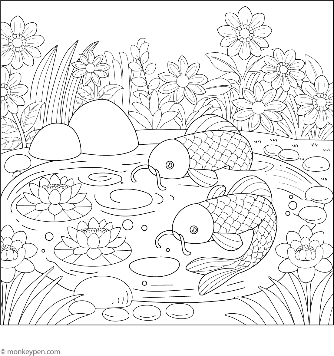 Discover the serene beauty of pond ecosystems with this koi fish colouring book. Each page features elegant koi swimming among lily pads, lotus flowers, gentle ripples, and tranquil garden environments. Some illustrations include playful koi with accompanying turtles or baby fish, while others depict Zen garden motifs and Japanese-inspired landscapes. The designs vary from simple outlines suitable for beginners to intricate scenes for more advanced colorists. This printable PDF aims to promote relaxation, artistic exploration, and appreciation for aquatic life, making it ideal for educational purposes or calming creative moments.