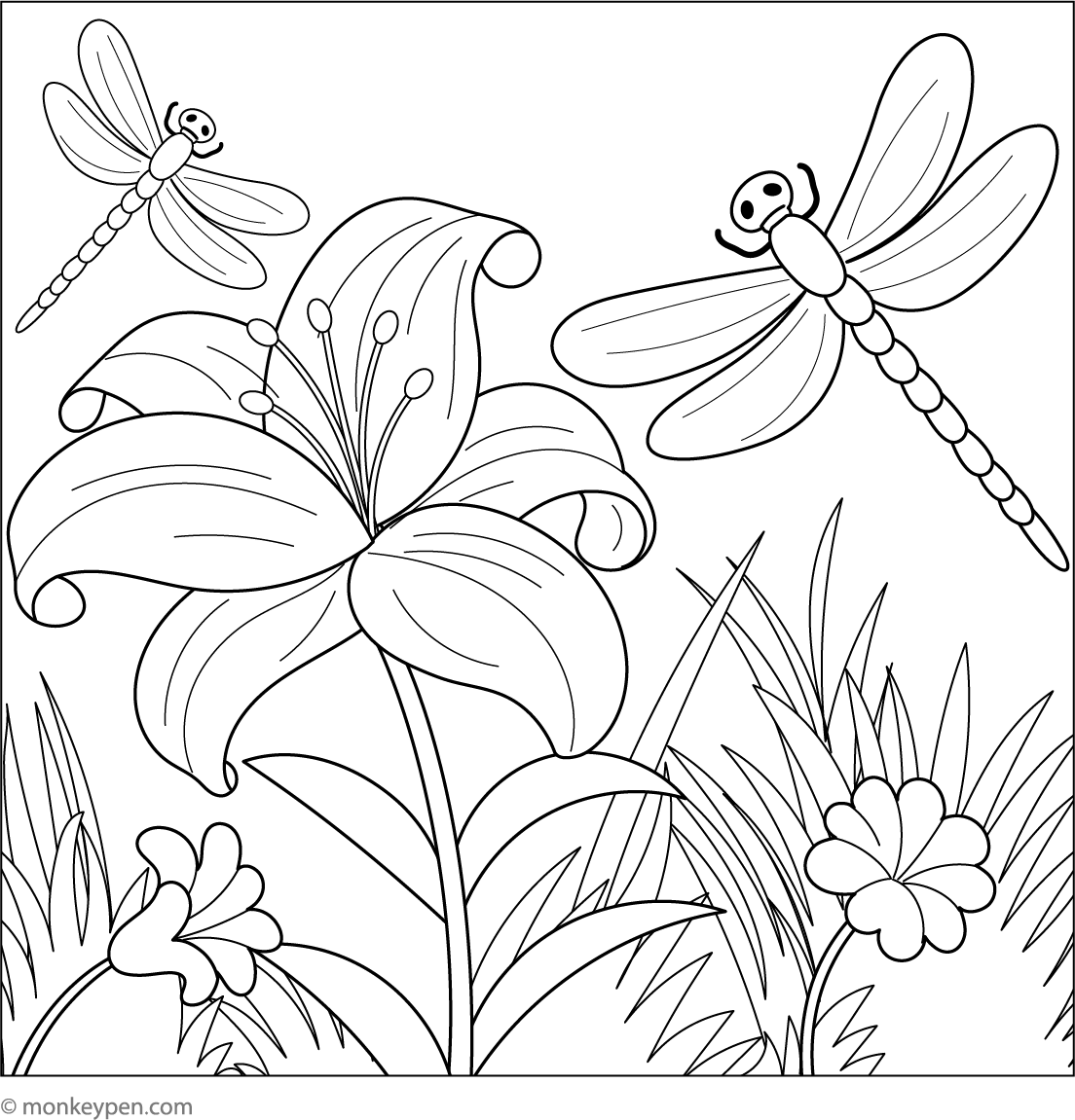 This detailed coloring page depicts a shimmering dragonfly gliding over a blooming lily in the garden. Children can choose to color the dragonfly’s wings in shades of blue or green and the flower in soft pinks or yellows. The intricate design promotes focus and relaxation while providing educational value about insects and aquatic plants. It offers a calming, nature-inspired scene that combines beauty and creativity in a fun coloring activity.