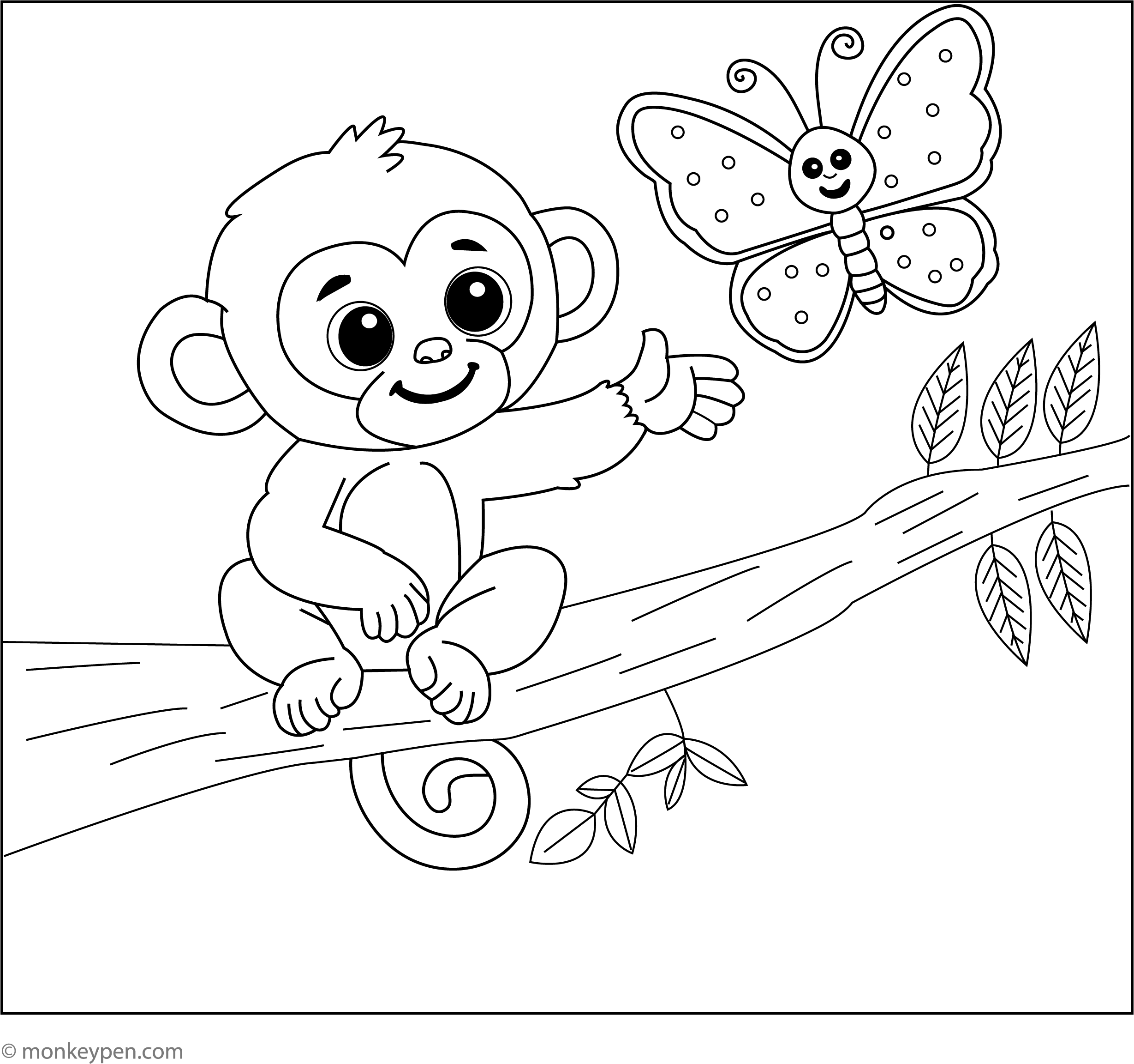 Children may choose to colour the monkey using shades of brown or tan, the butterfly with vivid yellows, blues, or purples, and the background in rich greens. This free, printable page educates children about the harmony of nature while fostering creativity and storytelling.