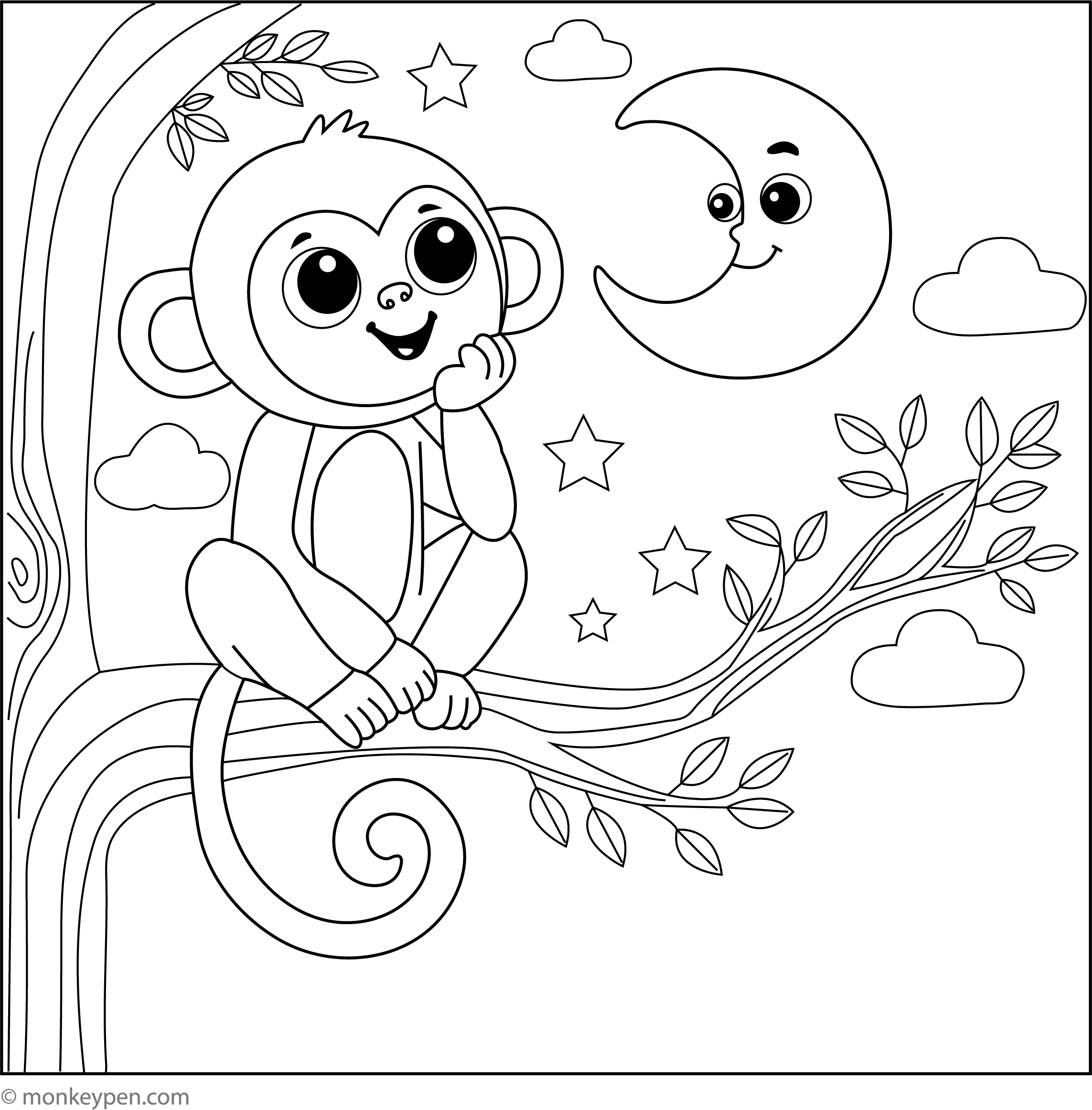 This enchanting colouring page presents a monkey perched on a tree branch or hill, gazing up at a luminous moon against a starry night sky. The tranquil scene is ideal for calming, creative endeavors.