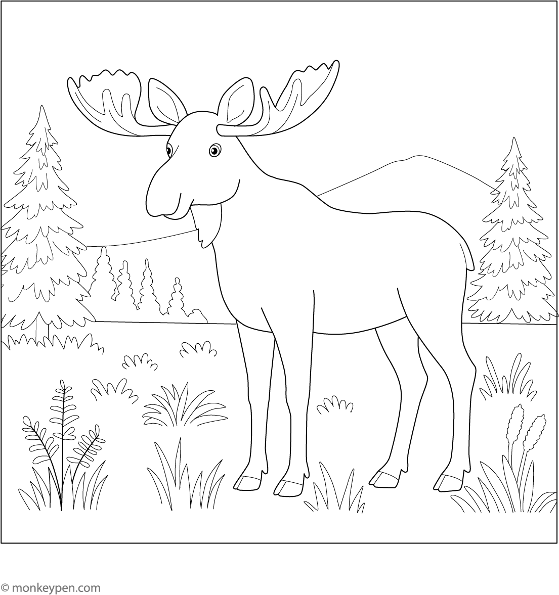 Embark on a wilderness adventure with this moose colouring book for kids. Each page depicts majestic moose in forest settings, near lakes, or standing tall with impressive antlers. Children can colour natural backgrounds such as trees, mountain ranges, and water bodies, fostering observation and artistic skills. The clear outlines are suitable for younger artists, while detailed scenery encourages older children to experiment with shading and depth. This printable PDF is ideal for wildlife education, classroom projects, or relaxing colouring sessions, inviting children to explore and celebrate the beauty of forest animals through engaging, educational illustrations that inspire curiosity about nature.