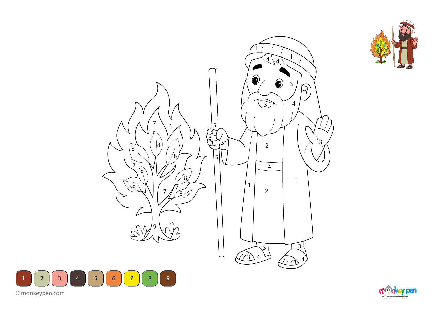 This Moses color-by-number activity features the biblical figure Moses holding the tablets of the Ten Commandments. Children will follow the numbered sections to color Moses’ robe, the stone tablets, and the desert landscape.