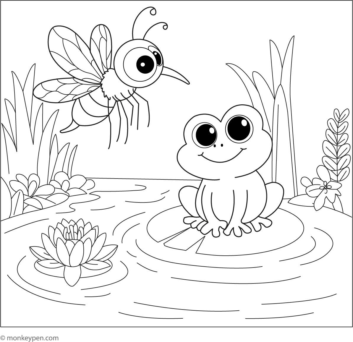 In this charming pond scene, a curious frog observes a buzzing mosquito nearby. The simple outlines make coloring easy, allowing children to color the frog’s green skin, the blue pond water, and the tiny mosquito’s wings. The lighthearted imagery introduces young learners to pond ecosystems in an engaging and friendly manner. Ideal for rainy days or insect-themed lessons, this page combines fun with educational value.