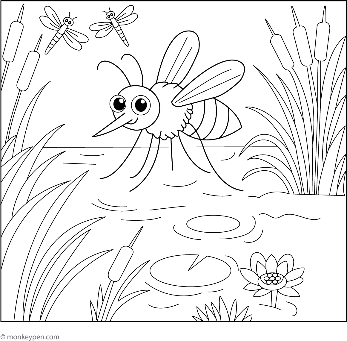 This detailed scene showcases a mosquito hovering above still water surrounded by cattails and reeds. Kids can color the green plants, brown mud, and reflections in the water. The page provides an opportunity to learn about insect habitats in wetland areas through art. Its simple yet engaging lines make it suitable for coloring practice and nature education, especially for children interested in wetlands and small creatures.