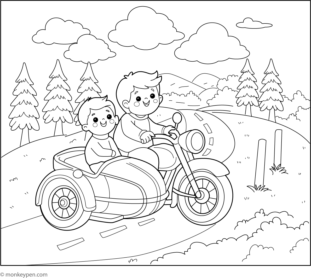 Motorcycle with a Sidecar Adventure | Free Coloring Page