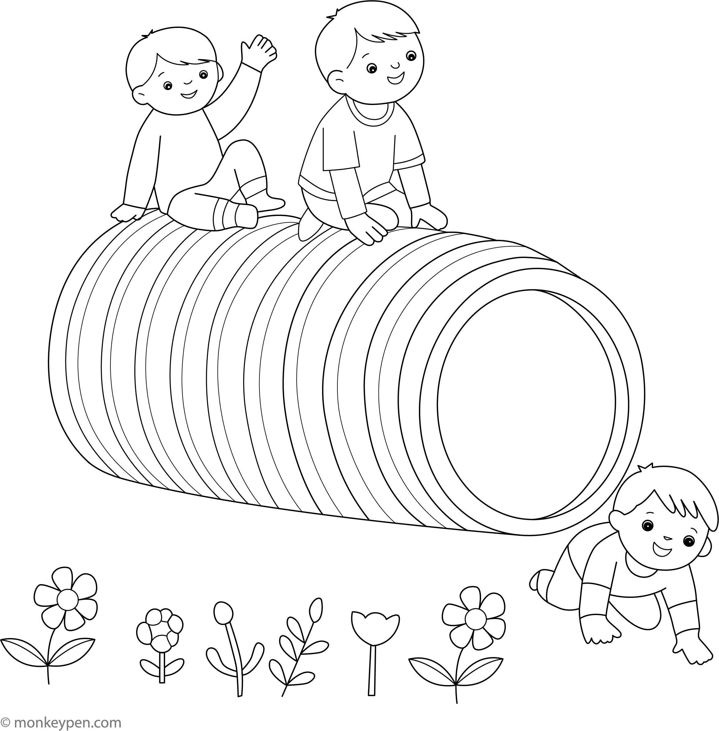 This interactive coloring illustration features a winding play tunnel commonly used in toddler playgrounds or indoor play areas. Children can be shown crawling through, peeking out, or giggling at the entrance.Color options include rainbow stripes or pastel patterns, fostering exploration of repetition, curves, and color blending.This activity emphasizes early movement, spatial awareness, and imaginative discovery, providing a calming yet engaging option for quiet play or safety lessons.