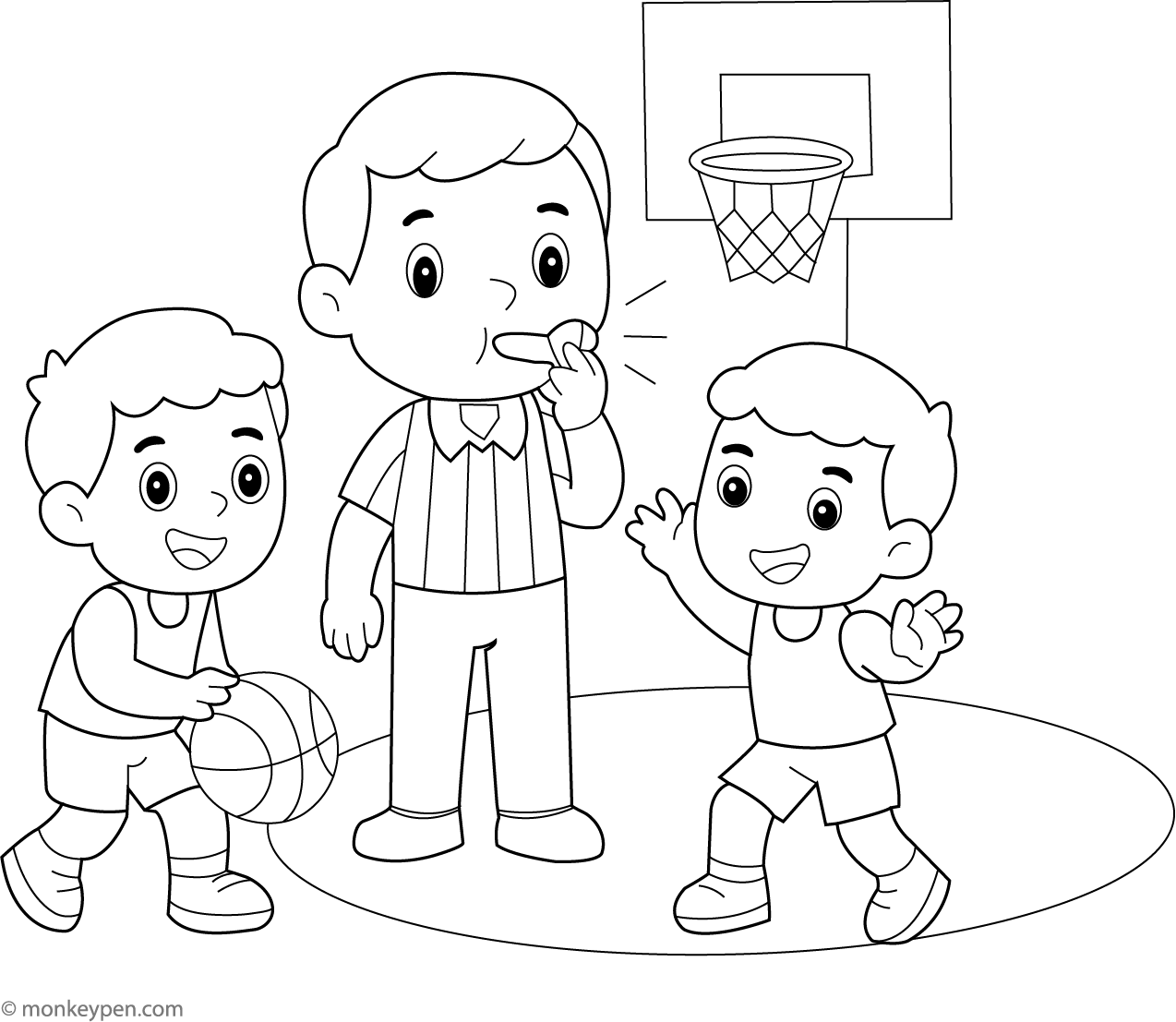 This scene features a basketball referee blowing a whistle during a game, signaling a foul or stoppage. The referee is dressed in a black-and-white striped uniform, with one hand raised to their mouth. The background may include players on the court awaiting the next play. Children can color the referee, the whistle, and the basketball court, adding vibrancy to the moment.