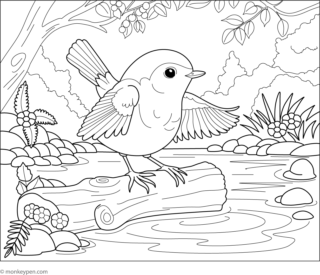 This colouring page shows a robin exploring the edge of a peaceful pond. Reeds, ripples and stones create a gentle nature setting that kids will enjoy colouring.
