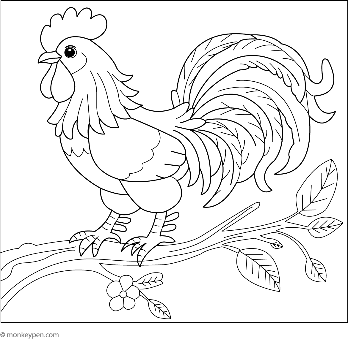 This colouring page depicts a rooster perched on a sturdy tree branch overlooking the farm. Children can colour the leaves, bark textures, feathers, and sky, promoting patience and creativity.