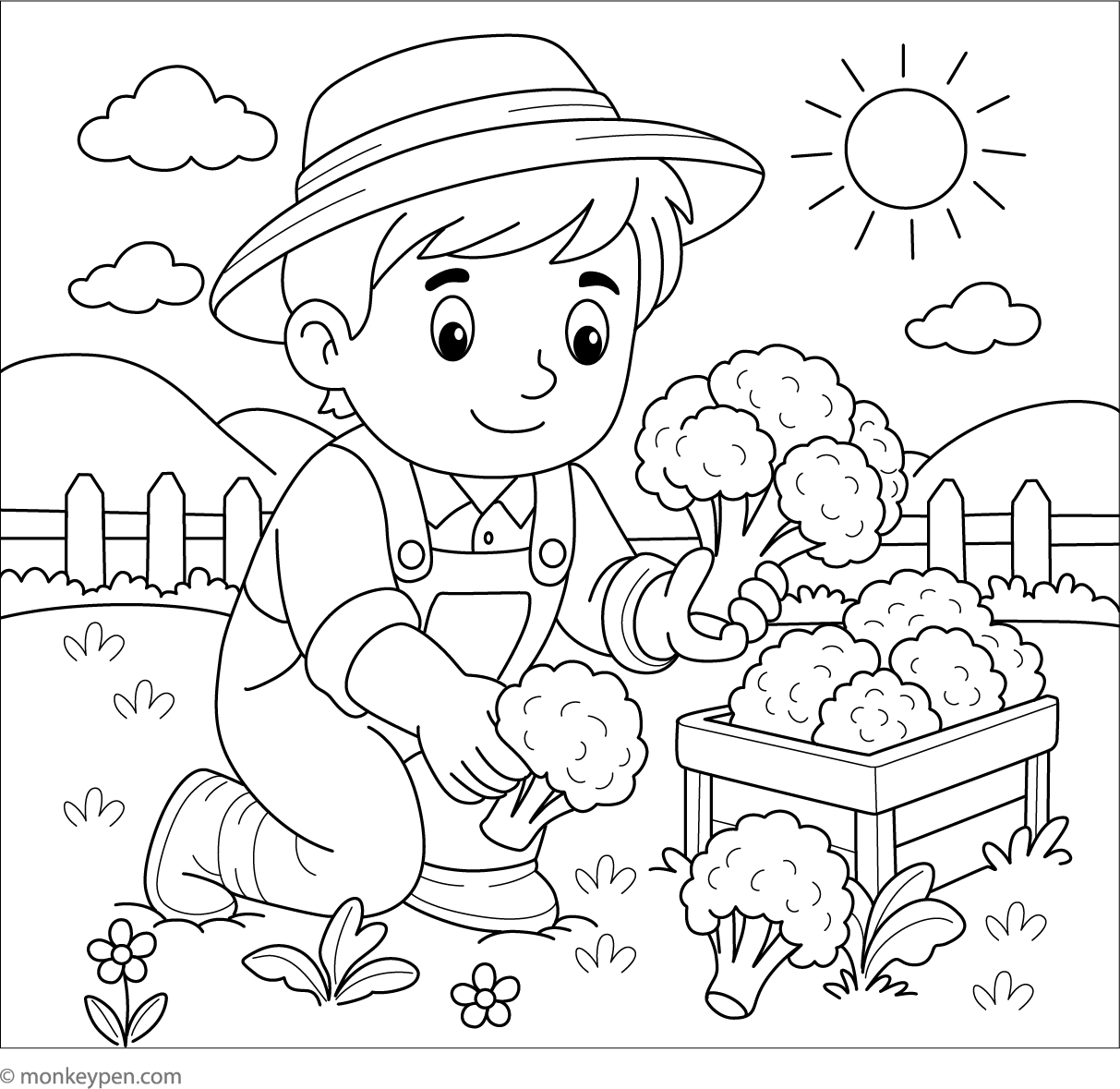 This coloring sheet displays a neat row of broccoli plants in a vegetable patch, with evenly spaced stems and fluffy florets. The open background encourages kids to add elements such as sunshine, rain clouds, worms, or small garden creatures. With repeating shapes and soft outlines, the scene helps develop confidence and fine motor skills. It provides a simple introduction to how vegetables are cultivated on farms and in home gardens.