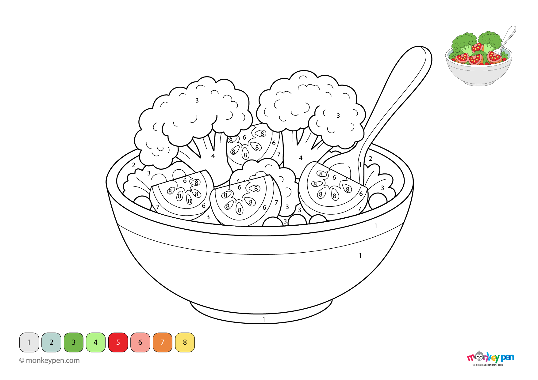 This salad with Broccoli color-by-number worksheet displays a fresh bowl of salad containing vegetables such as lettuce, tomatoes, and cucumbers. Children can follow the numbered sections to color each ingredient accurately.