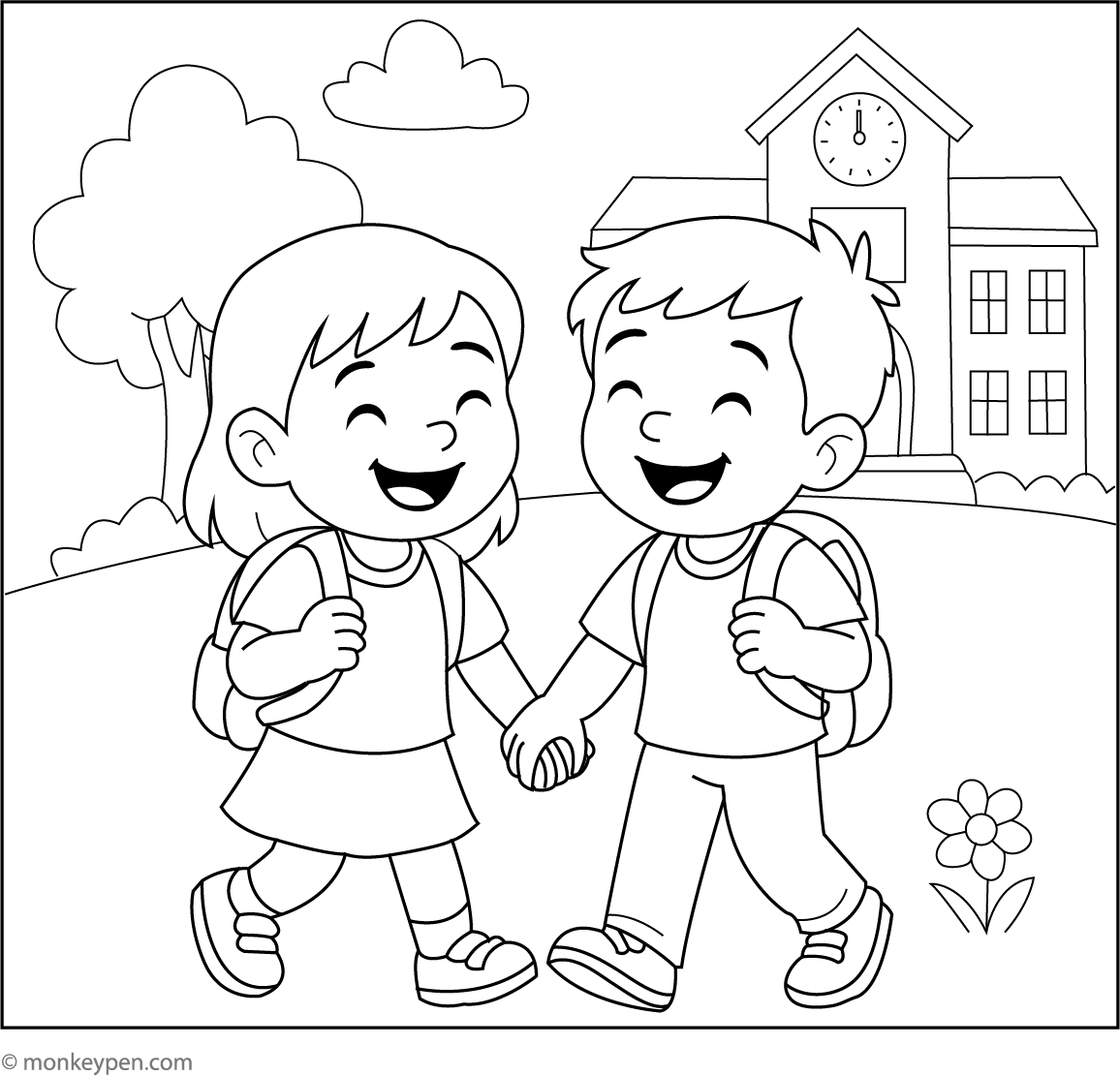 This lively colouring sheet portrays a two children engaging in happy conversation amidst a sunny schoolyard scene. Elements such as trees, playground structures, and school building provide additional colouring details. Children are encouraged to select vivid colours for clothing, footwear, and outdoor features, promoting creativity and fine motor development. The activity fosters imaginative storytelling, social awareness, and friendship-building skills, offering a fun and educational experience that explores group dynamics and outdoor play.